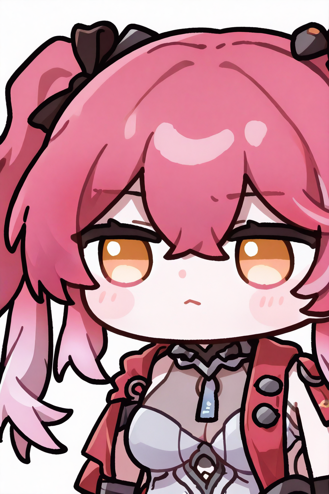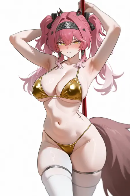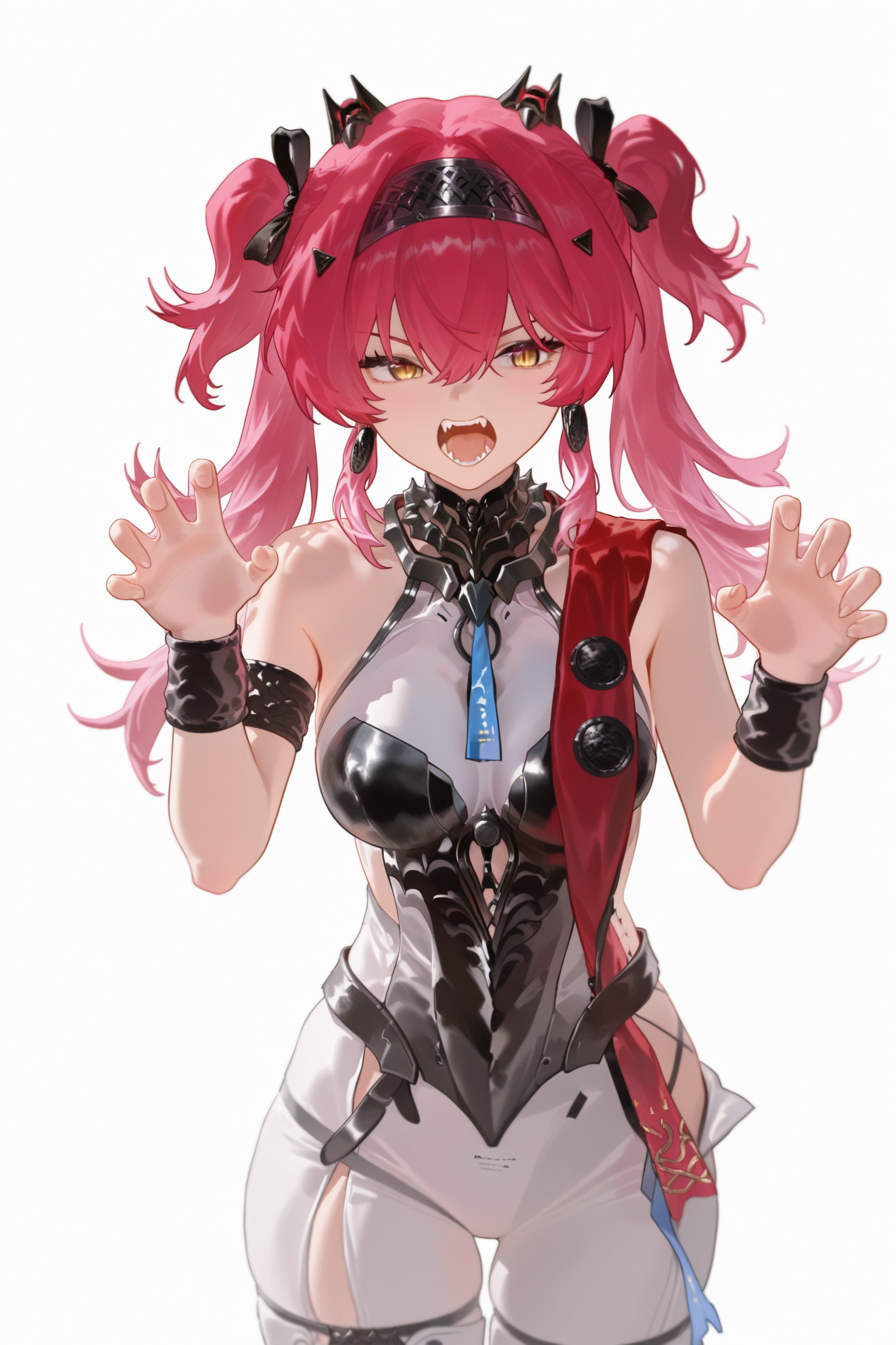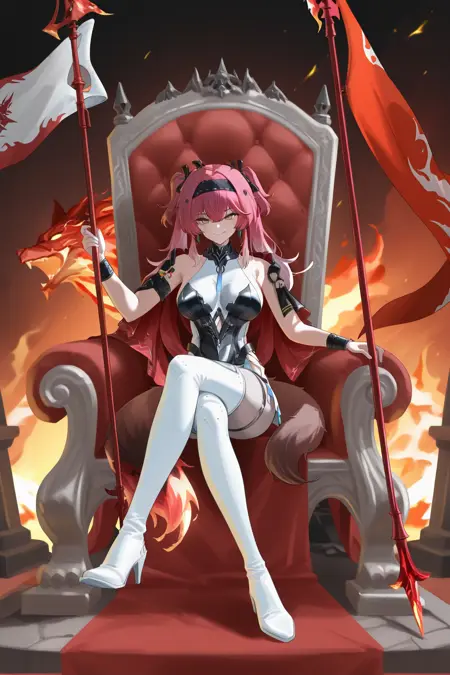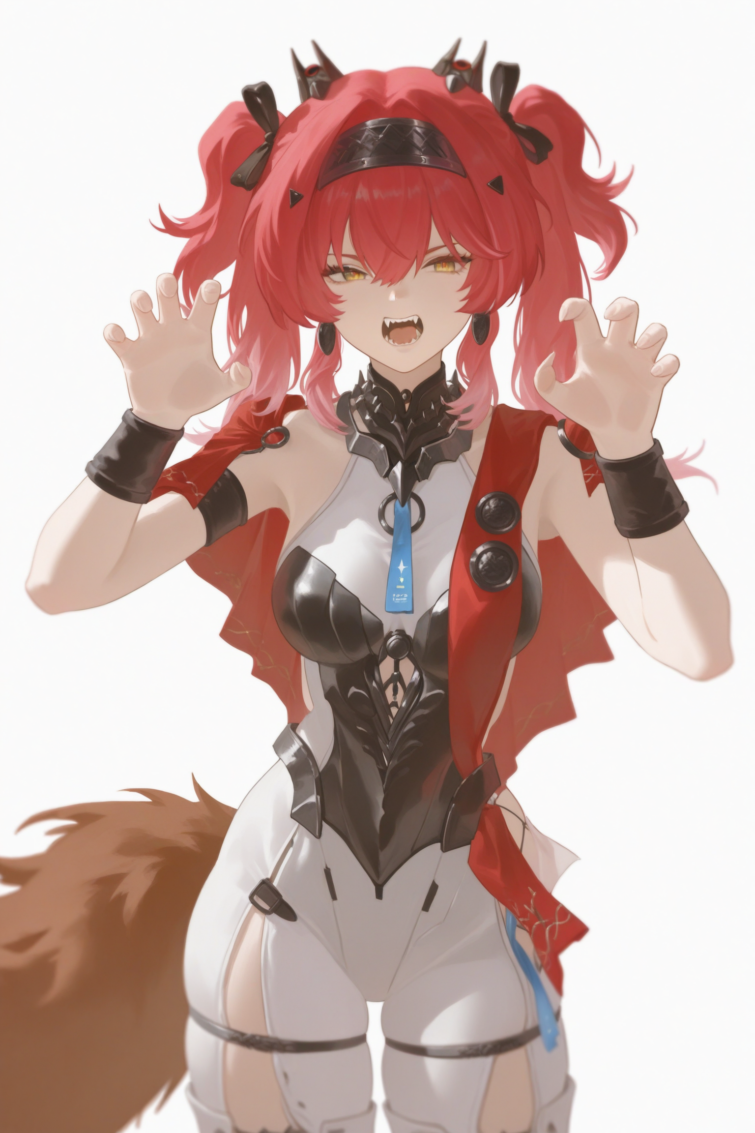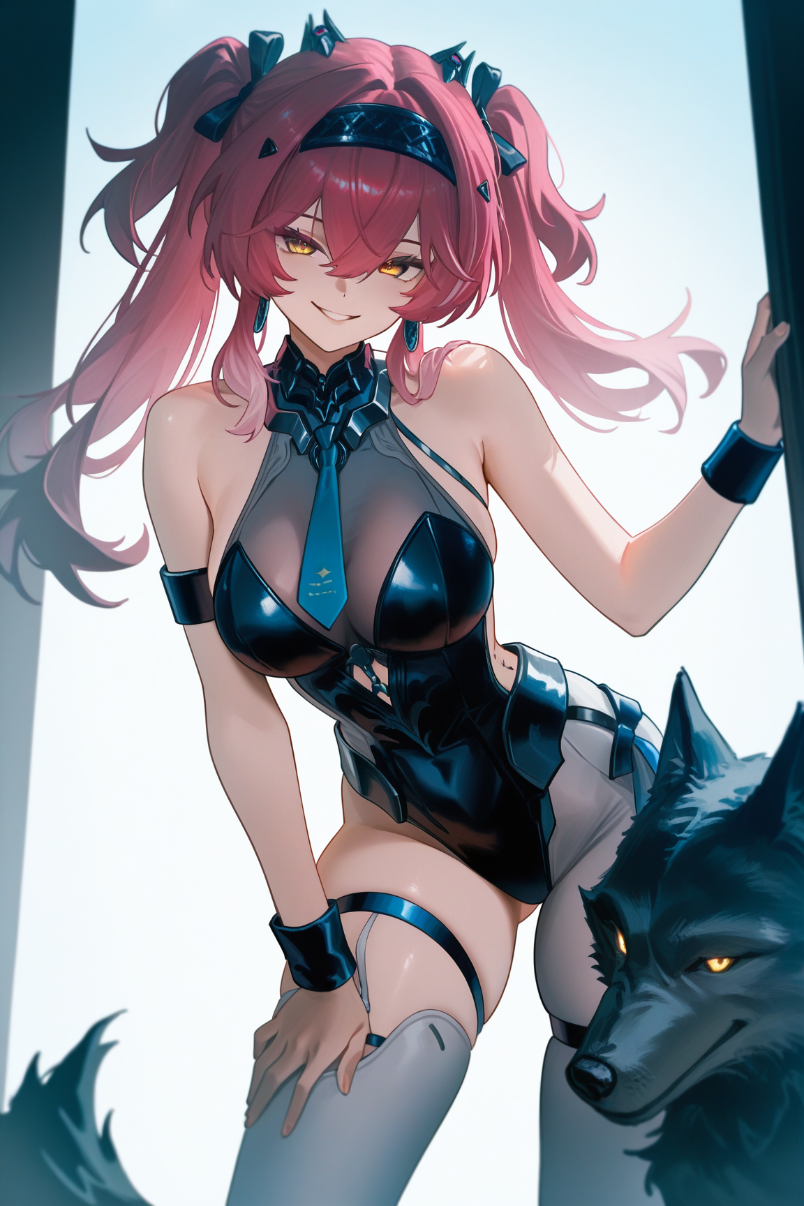 lupa \(wuthering waves\),1girl,pink hair, orange eyes, hairband,twintails,red cape, tail, black leotard, earrings, jewelry, solo,high heels,long hair,boots,thigh boots,leotard,hair between eyes,two side up,high heel boots,thighhighs