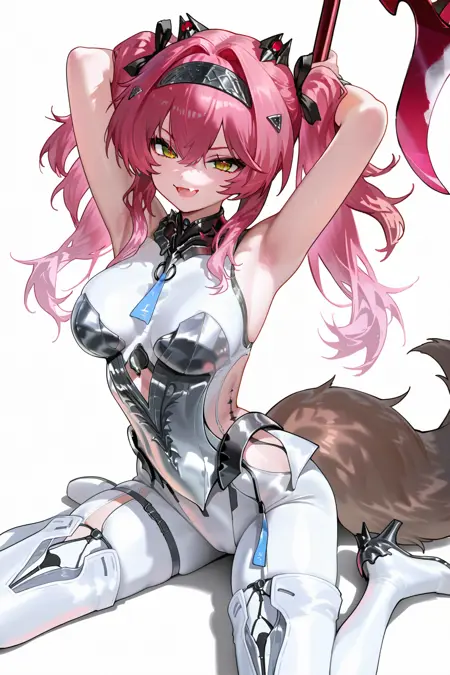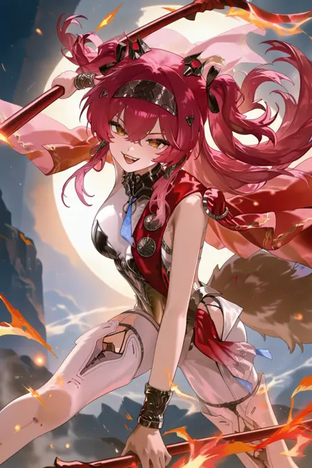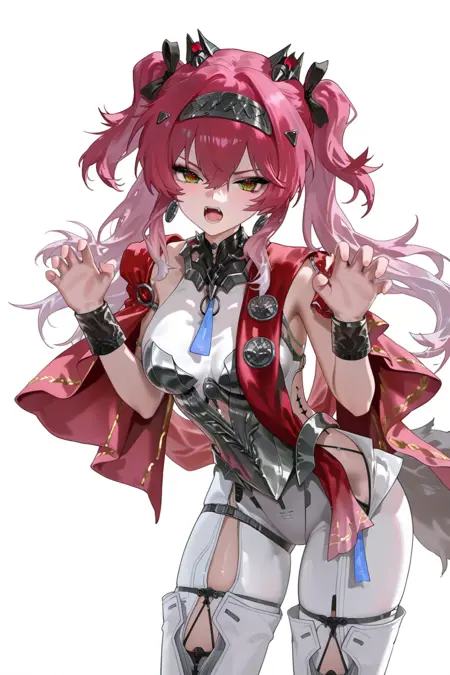 lupa \(wuthering waves\),1girl,粉发,橙色眼睛,发带,双马尾,红色斗篷,尾巴,黑色紧身衣,耳环,珠宝,单人,高跟鞋,长发,靴子,大腿靴,紧身衣,眼睛之间的头发,两侧向上,高跟靴,及膝靴