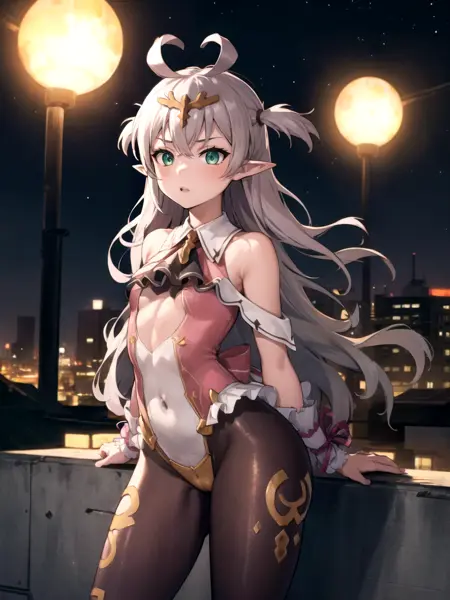 dslili, green eyes, long hair, two side up, hair ornament, pointy ears, ahoge, small breasts, leotard, covered navel, pantyhose, ribbon