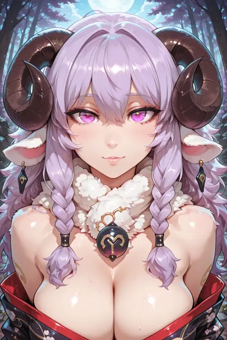 1girl, sbkindred, sheep girl, purple hair, long hair, braids, curved horns, pink eyes