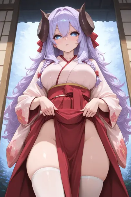 1girl, sbkindred, sheep girl, purple hair, long hair, braids, curved horns, pink eyes