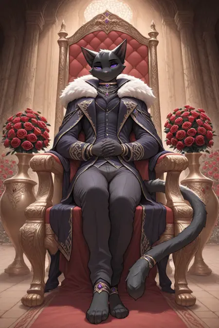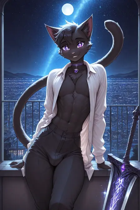 Duskmane, anthro cat, black fur, black short hair, purple eyes, cat ears, cat tail, pawpads