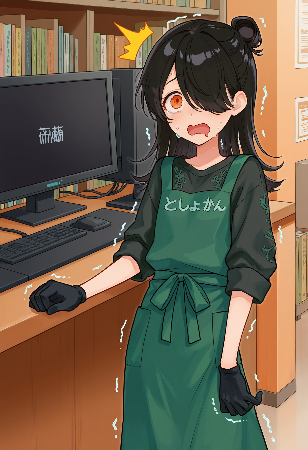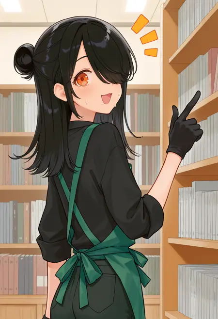 imamura, black hair, long hair, hair over one eye, long bangs, one eye covered, hair bun, single hair bun, tareme, orange eyes, green apron, text print, shirt, black gloves, pants, sleeves rolled up, sweatdrop
