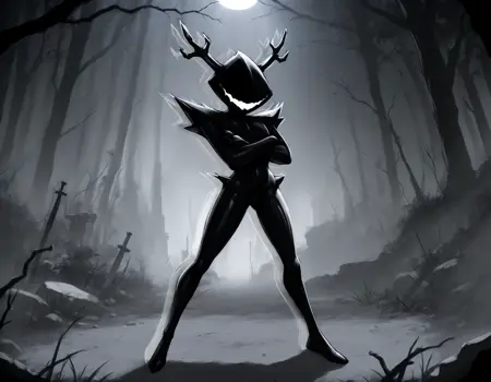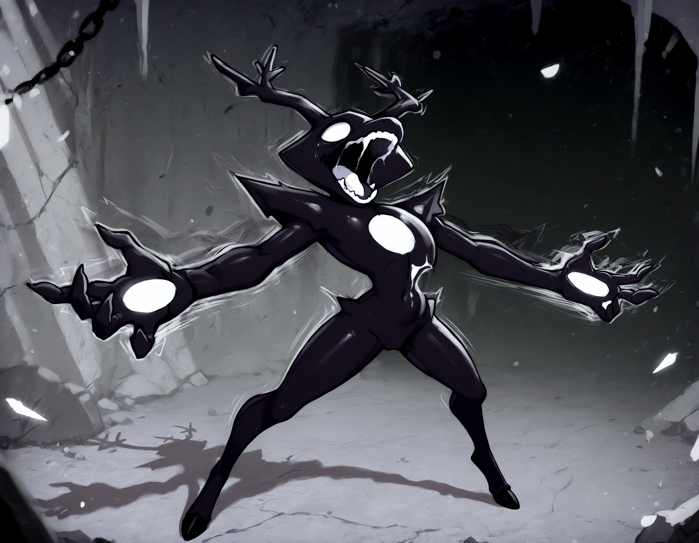 no eyebrows, no eyes, one-eyed, white eye, no pupils, (holes in hands:1.5), black body, spiked shoulders, hip spikes, antlers, small abdomen, afterimage, ambiguous gender, pseudo hair, evil smile, evil grin