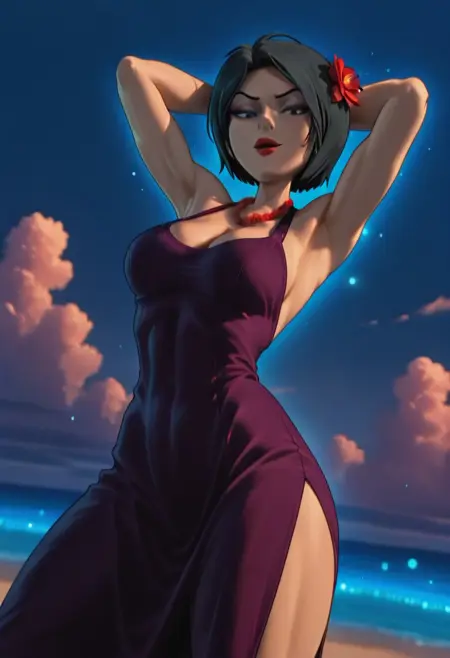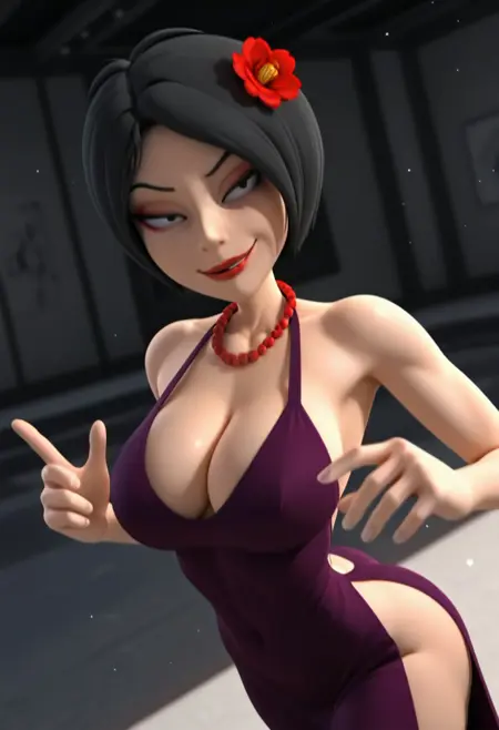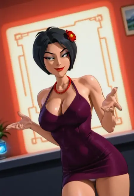 ChaseLB, 1girl, solo, short hair, black hair, bangs, black eyes, full lips, large breast, large butt, thick thighs, red flower in hair, red lipstick, makeup, red beads necklace, jewelry, cleavage, purple backless dress, cutout dress,