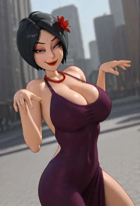 ChaseLB,1女孩,单独,短发,黑发,刘海,黑眼睛,丰满嘴唇,大乳房,大屁股,粗大腿,头发上红色花朵,红色口红,妆容,红色珠子项链,珠宝,乳沟,紫色露背连衣裙,镂空连衣裙,