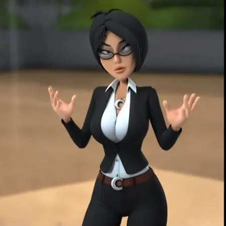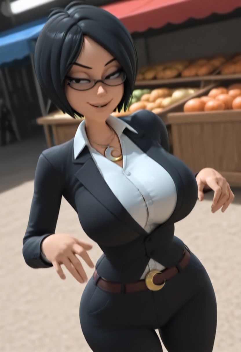 ChaseLB, 1girl, solo, short hair, black hair, bangs, black eyes, full lips, large breast, large butt, thick thighs, glasses, necklace with crescent, formal suit, black jacket, white shirt, belt with crescent, black pants,
