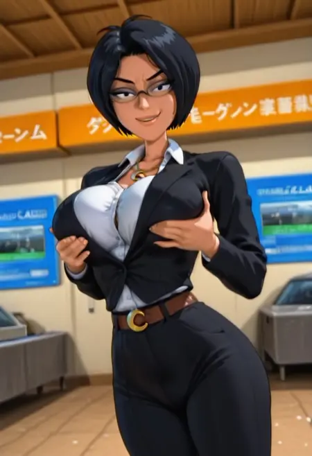 ChaseLB,1女孩,单独,短发,黑发,刘海,黑眼睛,丰满嘴唇,大乳房,大屁股,粗大腿,眼镜,新月项链,正式西装,黑色夹克,白衬衫,新月腰带,黑色长裤,