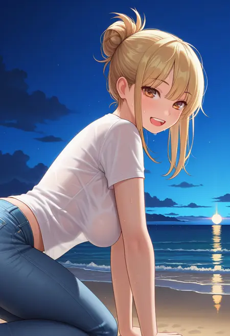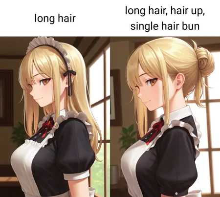 ouseww, brown eyes, blonde hair, long hair, hair up, single hair bun, medium breasts,