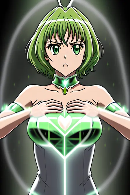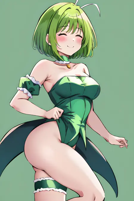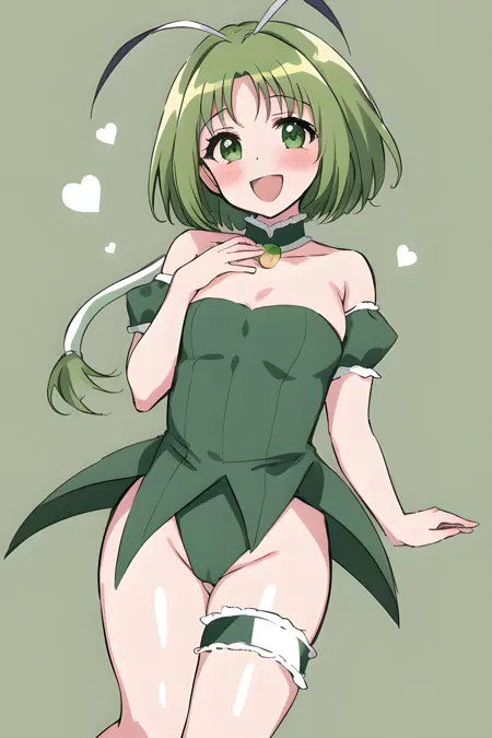Mew Mew衣装: 緑色のレオタード、緑色のシャツ、緑色のチョーカー、左腿にブライダルガーター、ふくらはぎの外側の袖、短い髪、髪のチューブ