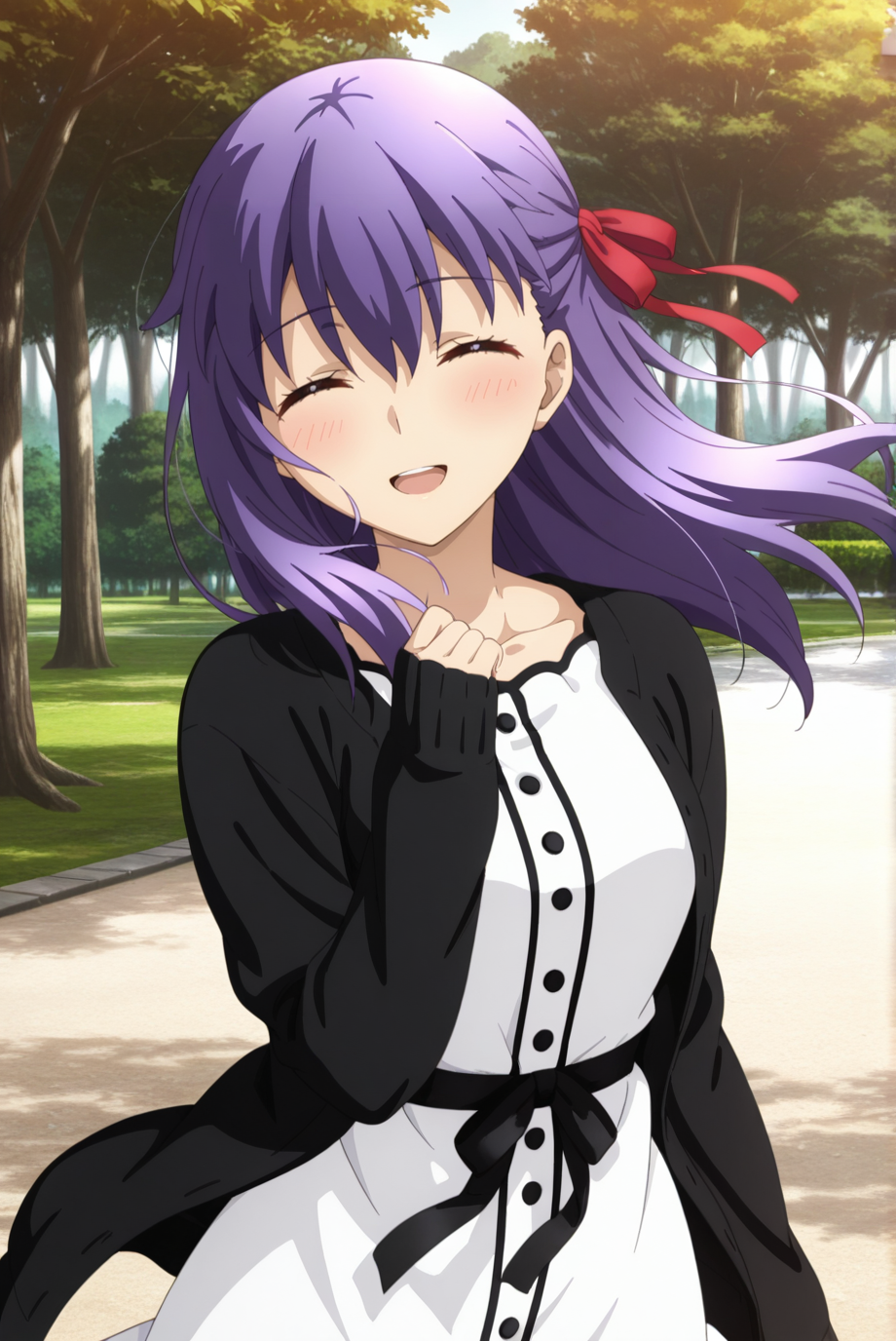 <lora:SakuraMatou-IL-v1-08:0.9>, ChopioSakuraMatou, long hair, purple hair, hair between eyes, purple eyes, no pupils, red ribbon, hair ribbon, looking at viewer,