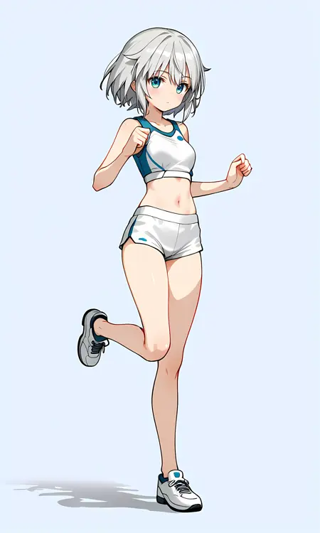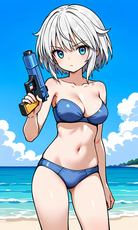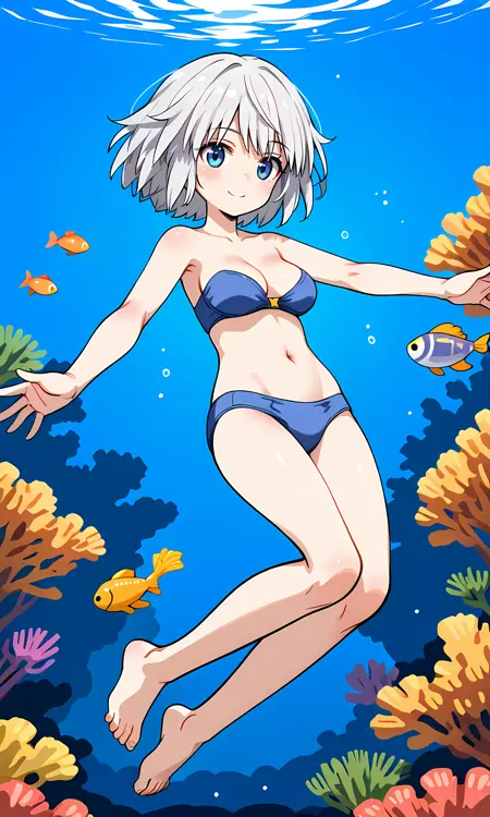 Swim wear: SIS-G00 Rishetta, silver hair, short hair, blue eyes , blue bandeau bikini, strapless bikini, bare hands, blue bikini panties, bare legs, bare foot,