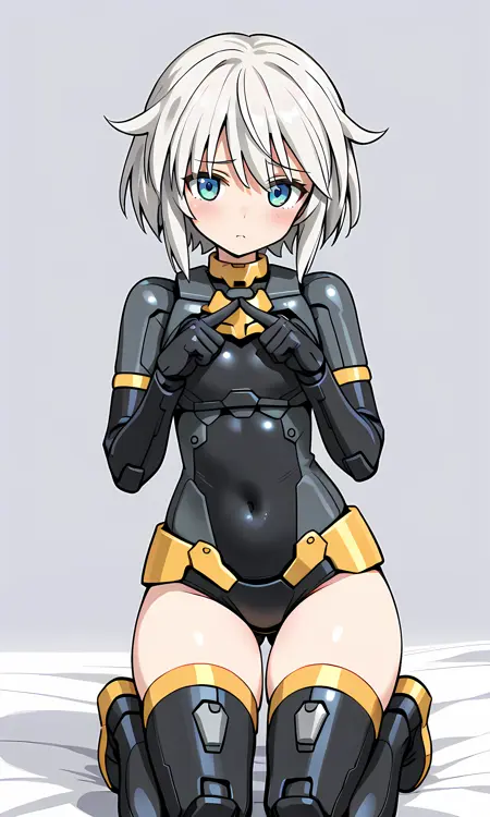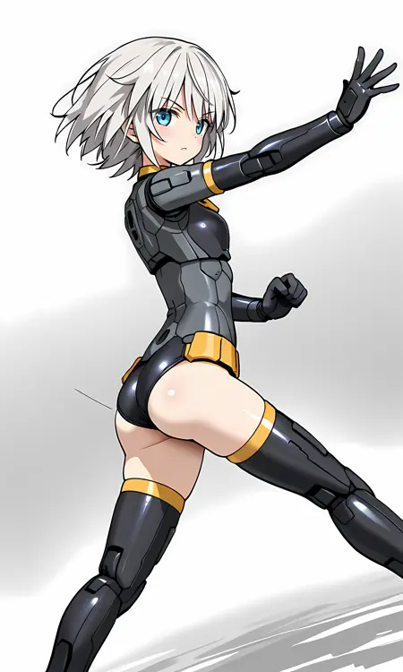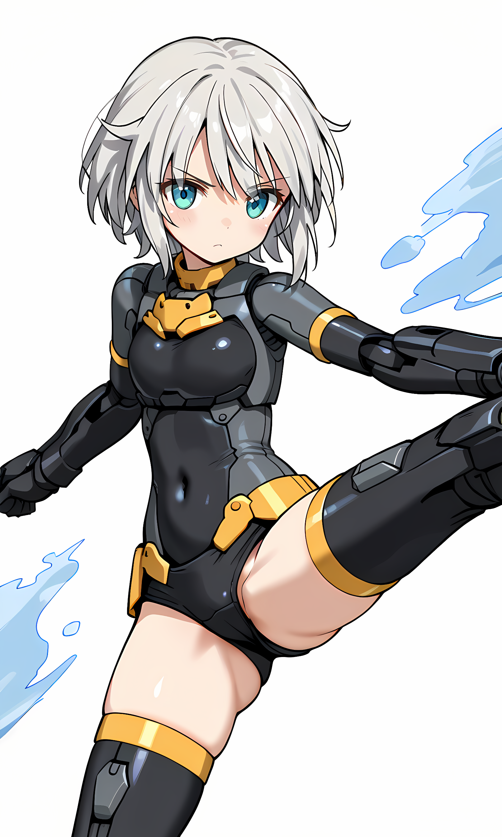 Normal Armor: SIS-G00 Rishetta, silver hair, short hair, blue eyes, black leotard, orange collar, orange accents on chest, orange accents on arms, orange accents on waist, black gloves, full-arm gloves, bare thighs, orange thigh rings, black thigh-high armored boots, black thigh guards on boots, black knee plates,