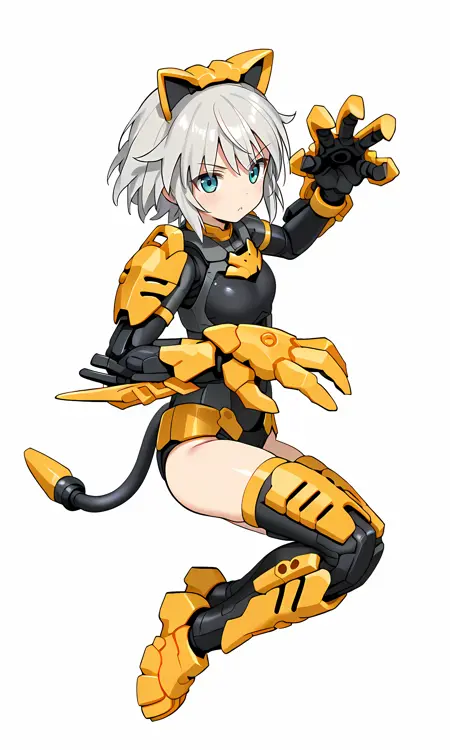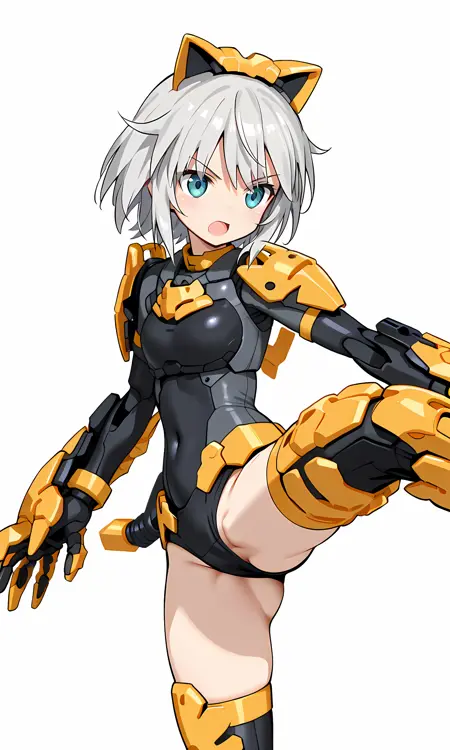 Armored Outfit 2: SIS-G00 Rishetta, silver hair, orange cat ear, short hair, blue eyes, black leotard, orange collar, orange accents on chest, orange accents on arms, orange accents on waist, black gloves, full-arm gloves, orange shoulder armor, orange bracelets, orange claw-like hands, bare thighs, orange thigh rings, orange armored legs with black accents, orange claw-like foot armor, black cable with orange accents,