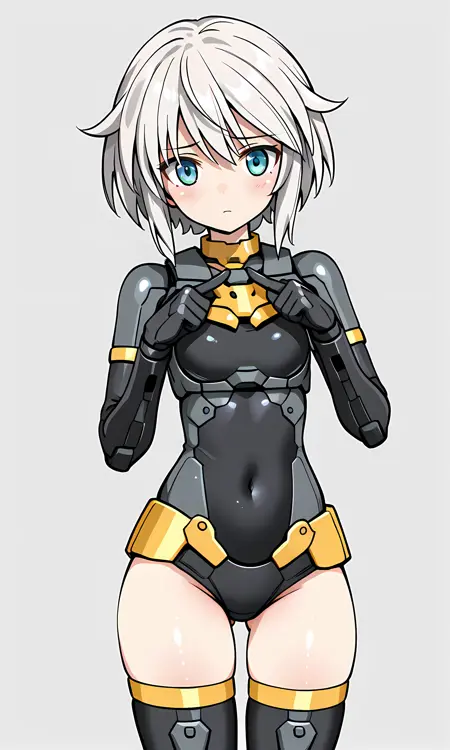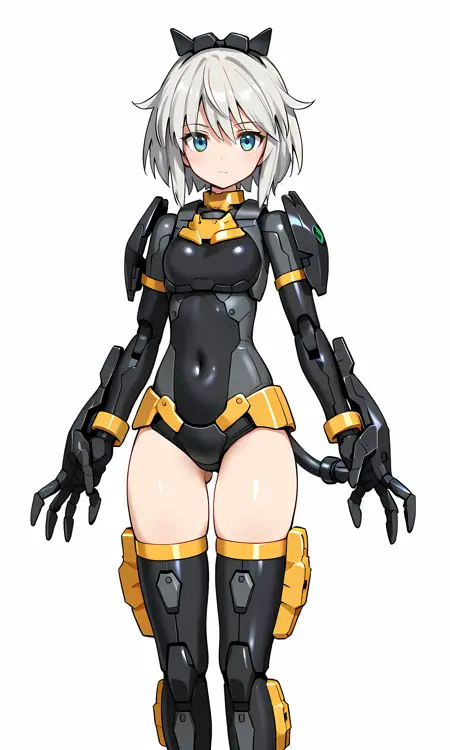 Armored Outfit 1: SIS-G00 Rishetta, silver hair, ribbon on head, short hair, blue eyes, black leotard, orange collar, orange accents on chest, orange accents on arms, orange accents on waist, black gloves, full-arm gloves, black shoulder armor, orange bracelets, black claw-like hands, bare thighs, orange thigh rings, black thigh-high armored boots, black thigh guards on boots, orange thigh attachments, black knee plates, black cable