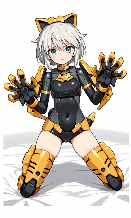 アーマードアウトフィット2:SIS-G00 Rishetta、シルバー髪、オレンジ色の猫の耳、ショートヘア、青い瞳、黒いレオタード、オレンジ色のカラー、胸元のオレンジ色のアクセント、腕のオレンジ色のアクセント、腰のオレンジ色のアクセント、黒い手袋、フルアーム手袋、オレンジ色の肩アーマー、オレンジ色のブレスレット、オレンジ色の爪のような手、太もも露出、オレンジ色の太ももリング、オレンジ色のアーマードレッグ(黒いアクセント付き)、オレンジ色の爪のような足アーマー、オレンジ色のアクセント付き黒いケーブル、