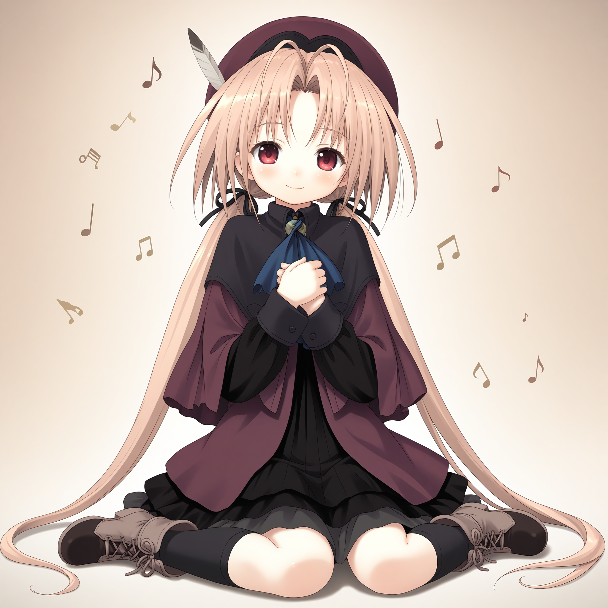 Phorni,red eyes,twintails,hair ribbon,black ribbon,feather hair ornament,