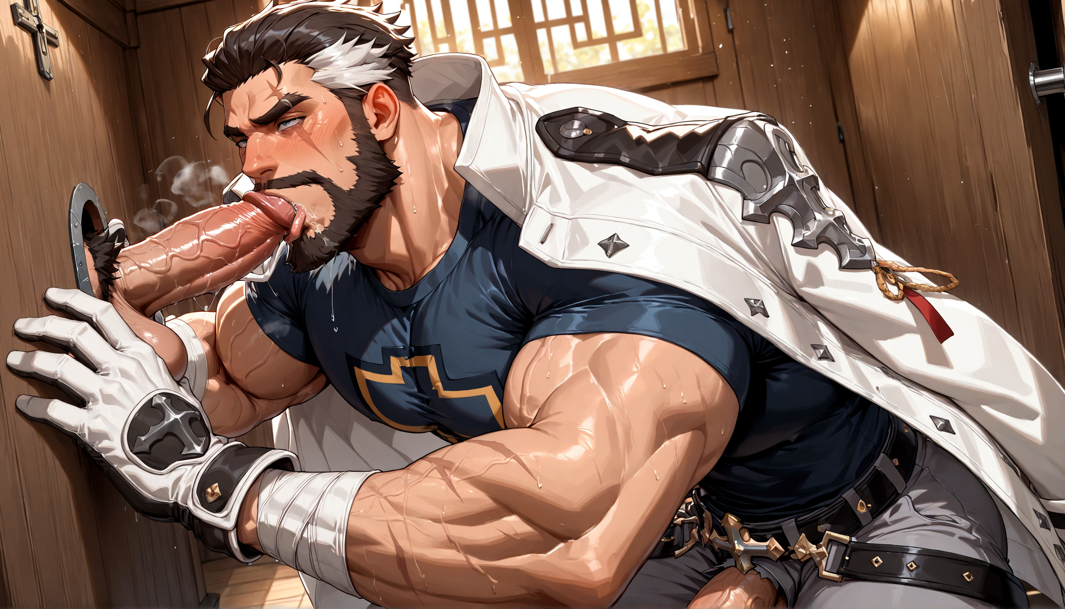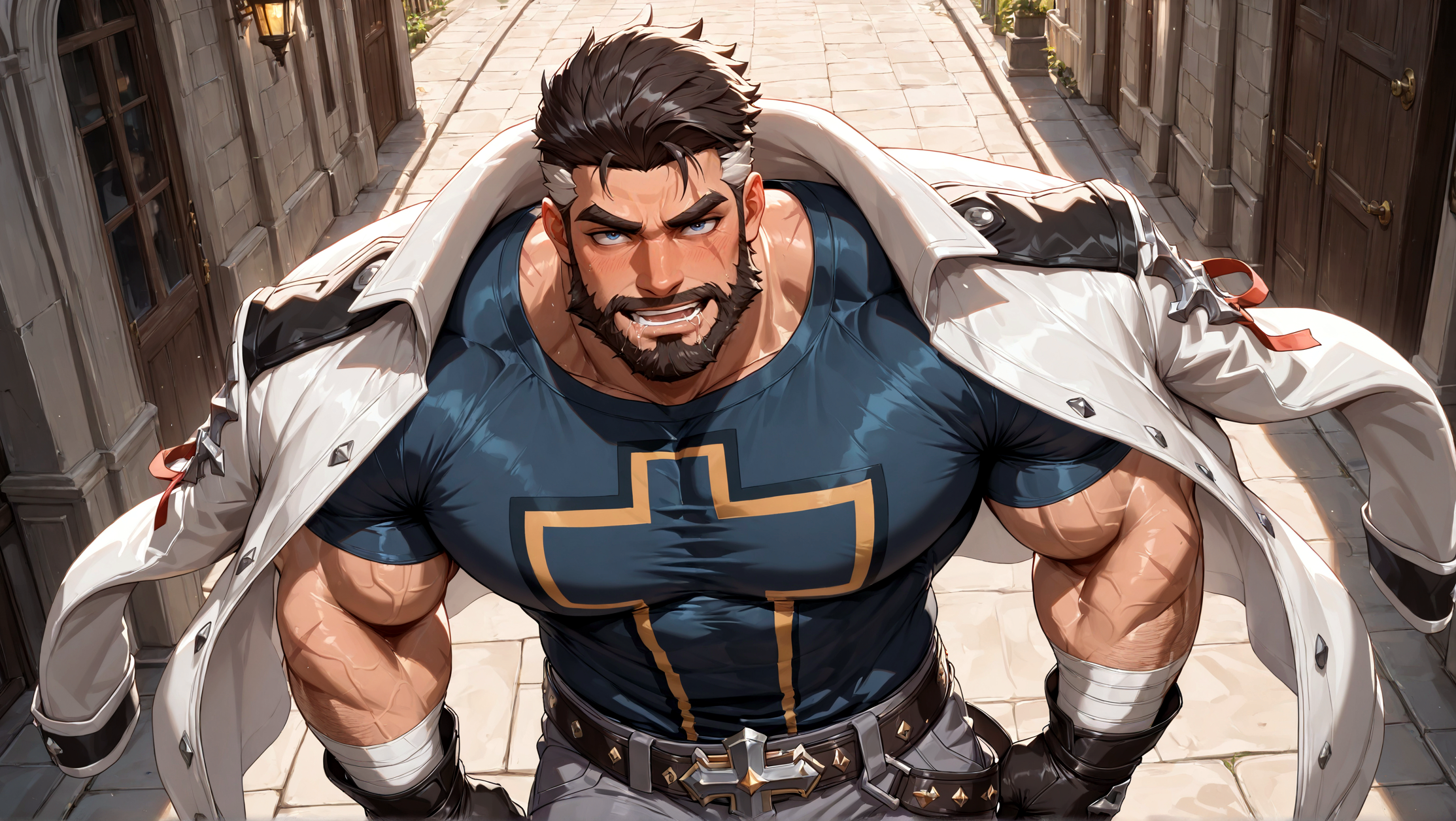 bara,gay,male focus, bara, muscular, dnfmonk,mustache,beard,multicolored hair,scar on face, thick eyebrows, ,facial hair,short hair, full heavy beard, Mature male,bara, muscular male,heavy beard, shirt, jacket, gloves,veiny face, belt,whitle jacket on shoulders, torn clothes, scar on left eyes face,