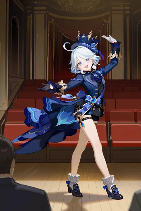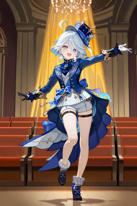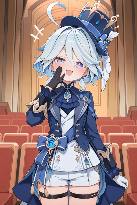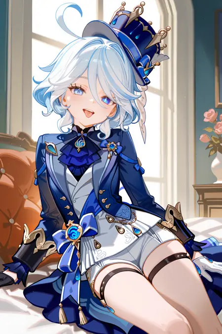 버전 3 이상: 페뉴마 푸리나(흰색) — furina (genshin impact), 단발, 이안색 눈, 맞지 않는 장갑, 탑햇, 파란 자켓, 허리 캡, 아스코트, 흰색 웨스트코트, 허리 리본, 흰색 숏팬츠, 허벅지 스트랩, 블록 힐, 프릴 양말