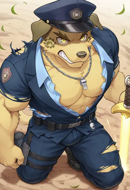 Outfit Prompts: "police uniform, police hat, silver whistle on necklace, watch, black tabi, multicolored puffy jacket, white shirt, black cargo pants, chain necklace with crescent charm, black hat, tennis shoes, black socks, fingerless gloves, black fundoshi with crescent symbol, yellow life vest"