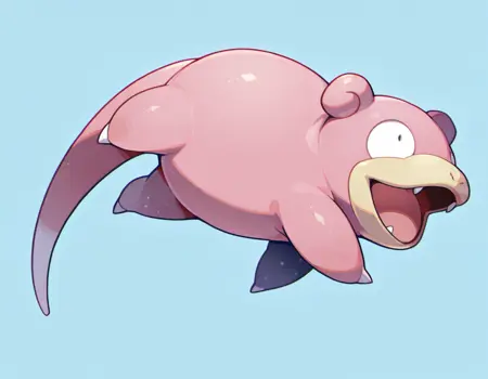 프롬프트: slowpoke, full body, slightly turned, two eyes visible, no humans, pokemon, (creature), solo, open mouth, fangs, on stomach, lying, in a river lora:slowpokeXL:1