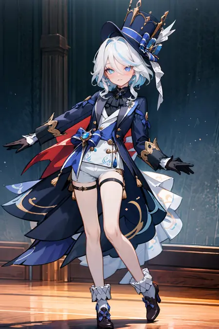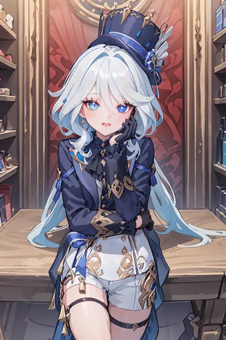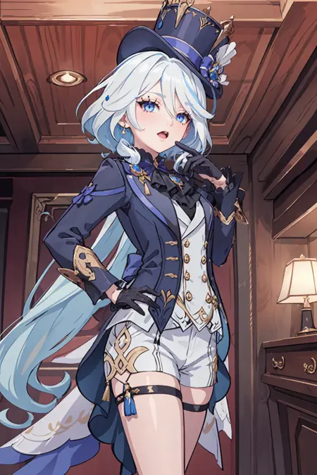 Version 3 and above, for Pneuma Furina (White): furina \(genshin impact\), short hair, heterochromia, mismatched gloves, top hat, blue jacket, waist cape, ascot, white waistcoat, waist bow, white shorts, thigh strap, block heels, frilled socks