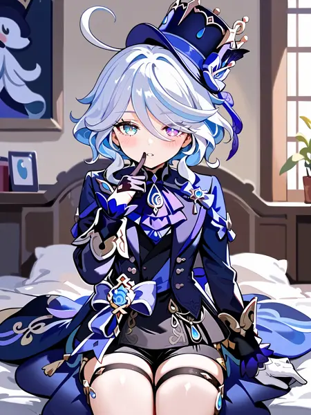 版本 3 及以上,用于 Ousia Furina(黑色):furina (genshin impact),短发,异色瞳,不匹配的手套,高顶帽,蓝色夹克,腰披,领结,黑色背心,腰间蝴蝶结,黑色短裤,大腿绑带,方跟鞋,荷叶边袜子