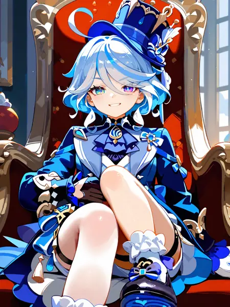 版本 3 及以上,用于 Pneuma Furina(白色):furina (genshin impact),短发,异色瞳,不匹配的手套,高顶帽,蓝色夹克,腰披,领结,白色背心,腰间蝴蝶结,白色短裤,大腿绑带,方跟鞋,荷叶边袜子