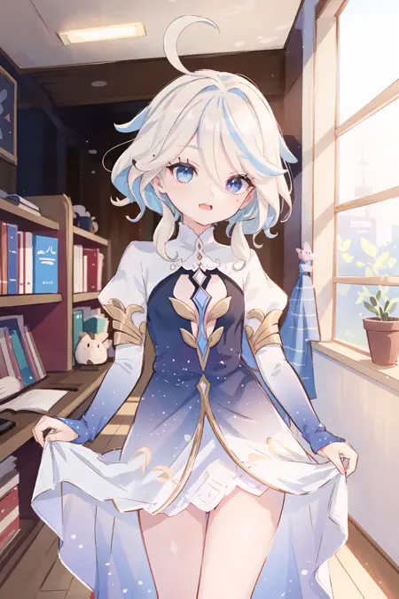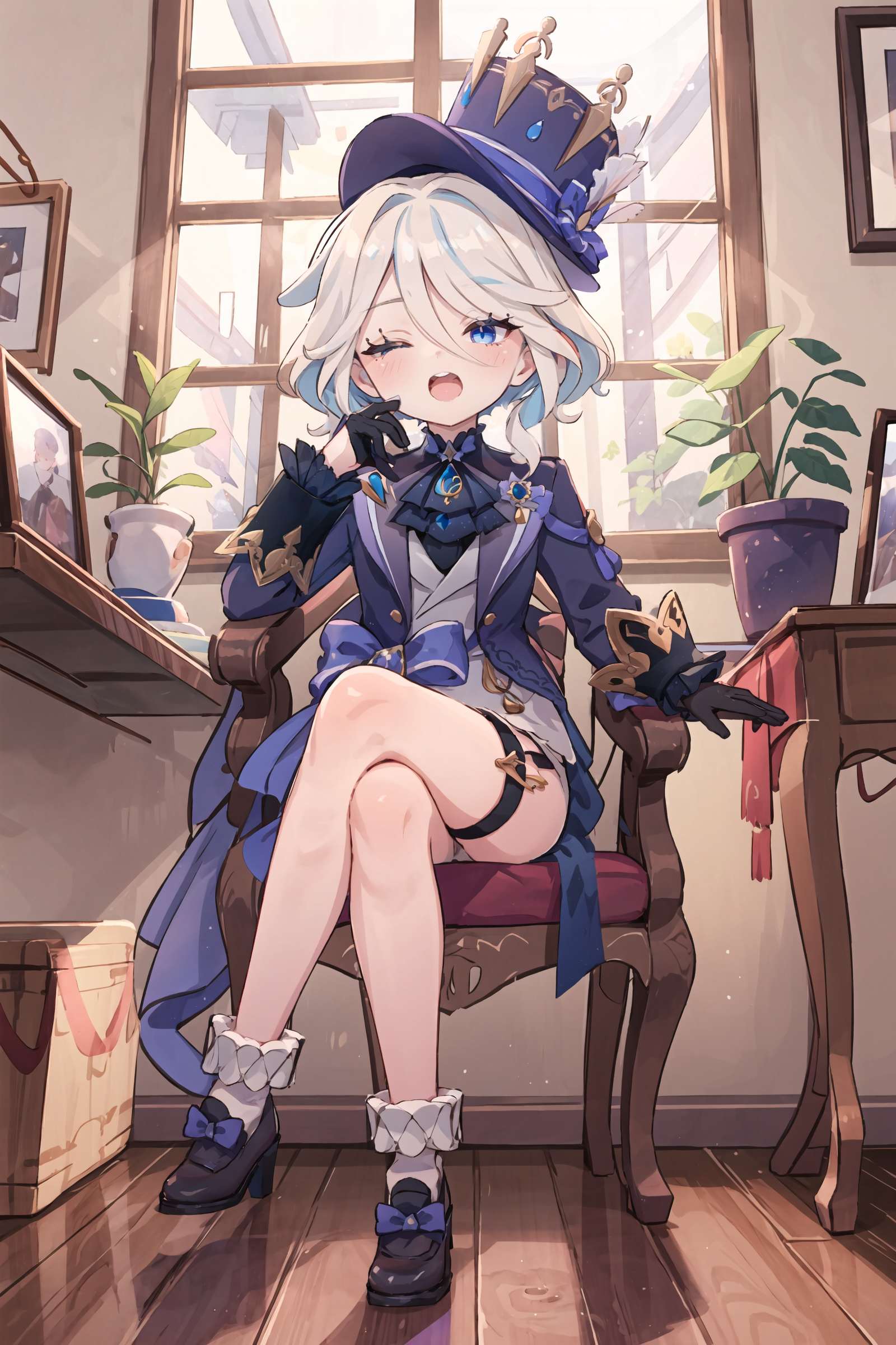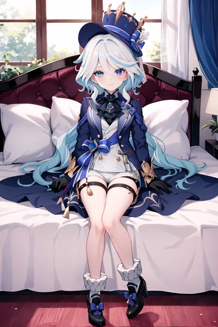バージョン3以上向け(Pneuma Furina(白)):furina (genshin impact)、ショートヘア、虹彩異色症、左右非対称の手袋、高級帽、青色ジャケット、ウエストカーディガン、アスコット、白いベスト、ウエストボウ、白いショートパンツ、太ももストラップ、ブロックヒール、フリルソックス
