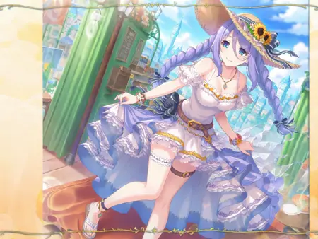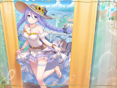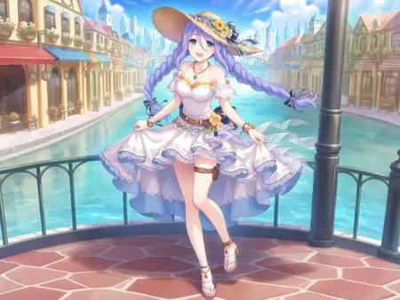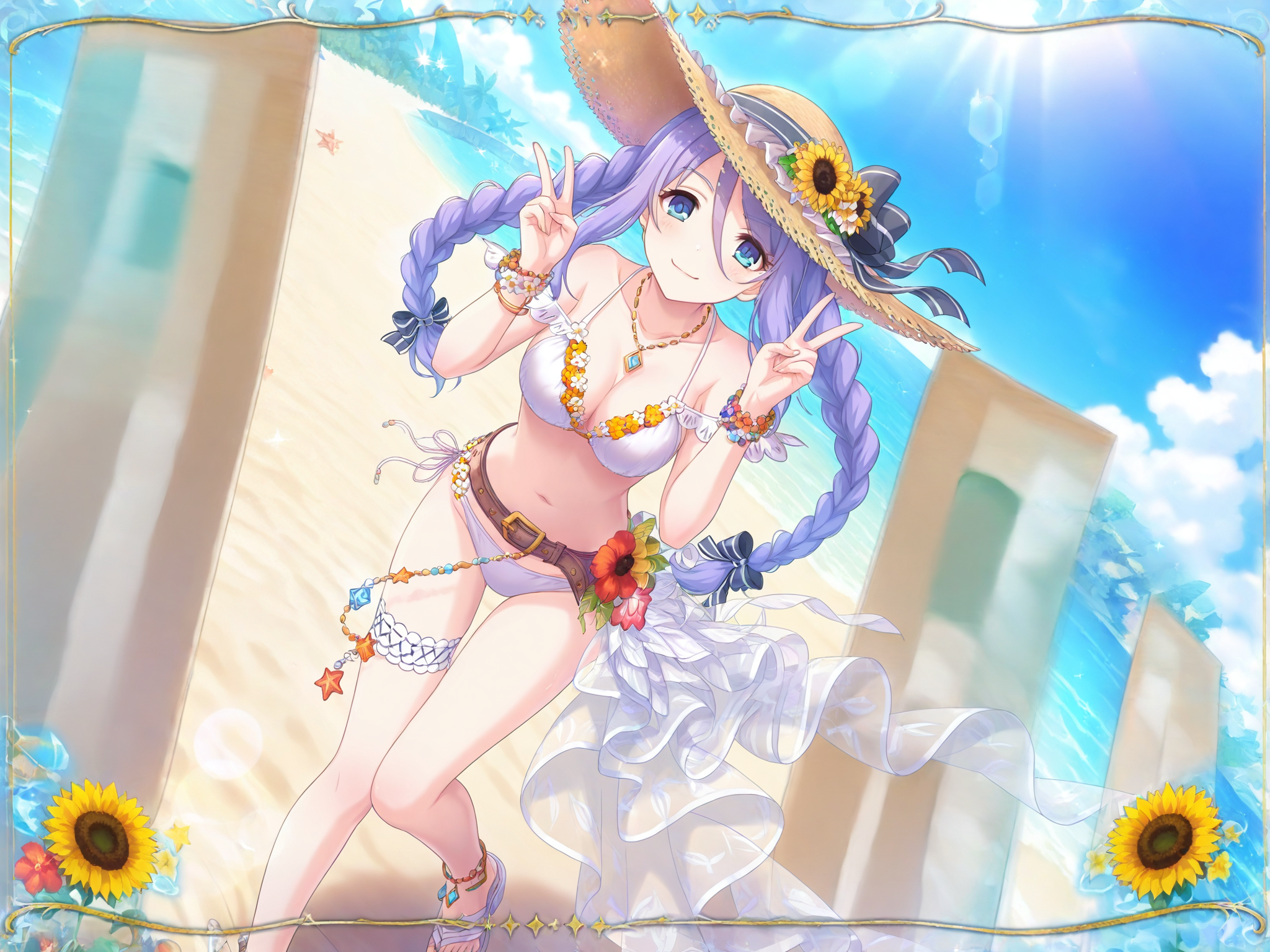 incredibly absurdres,lora:Shizuru5464:0.9,1girl,hat flower,jewelry,white bikini,swimsuit,sunflower,hat ribbon,twin braids,straw hat,ocean,sandals,purple hair,necklace,black ribbon,flower bracelet,blue eyes,brown belt,hat bow,anklet,bare shoulders,side-tie bikini bottom,thigh strap,white ribbon,beach,double_v,