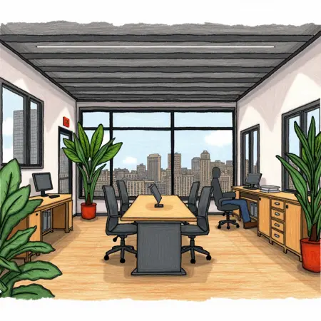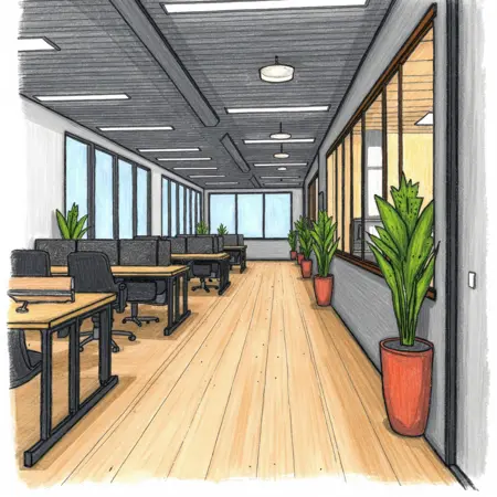 handDawing a drawing of the inside interior of a modern office space. Tech start up vibe. Sleek and modern office design. Highly detailed design with many small features, full color drawing with shading and rich colors.