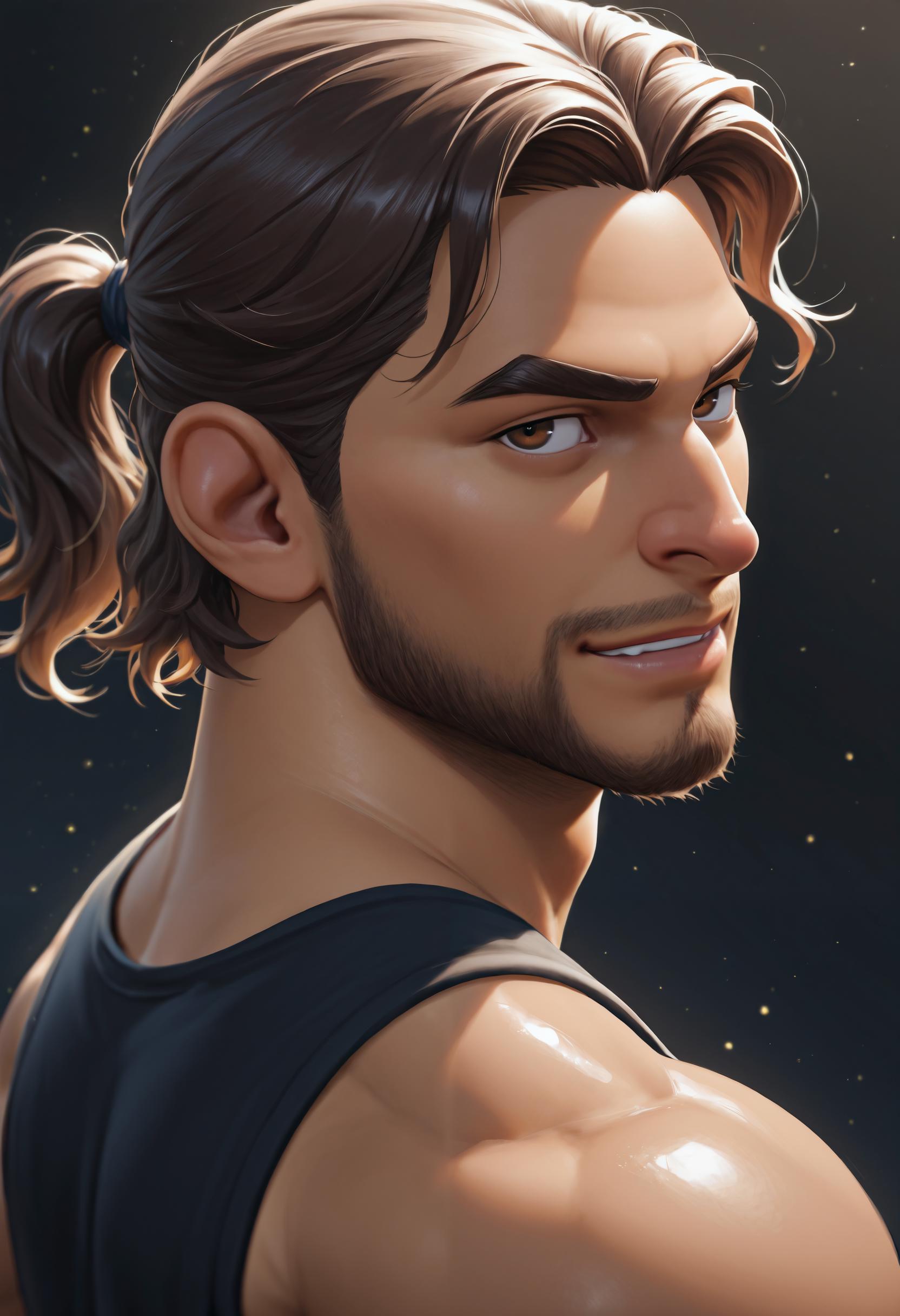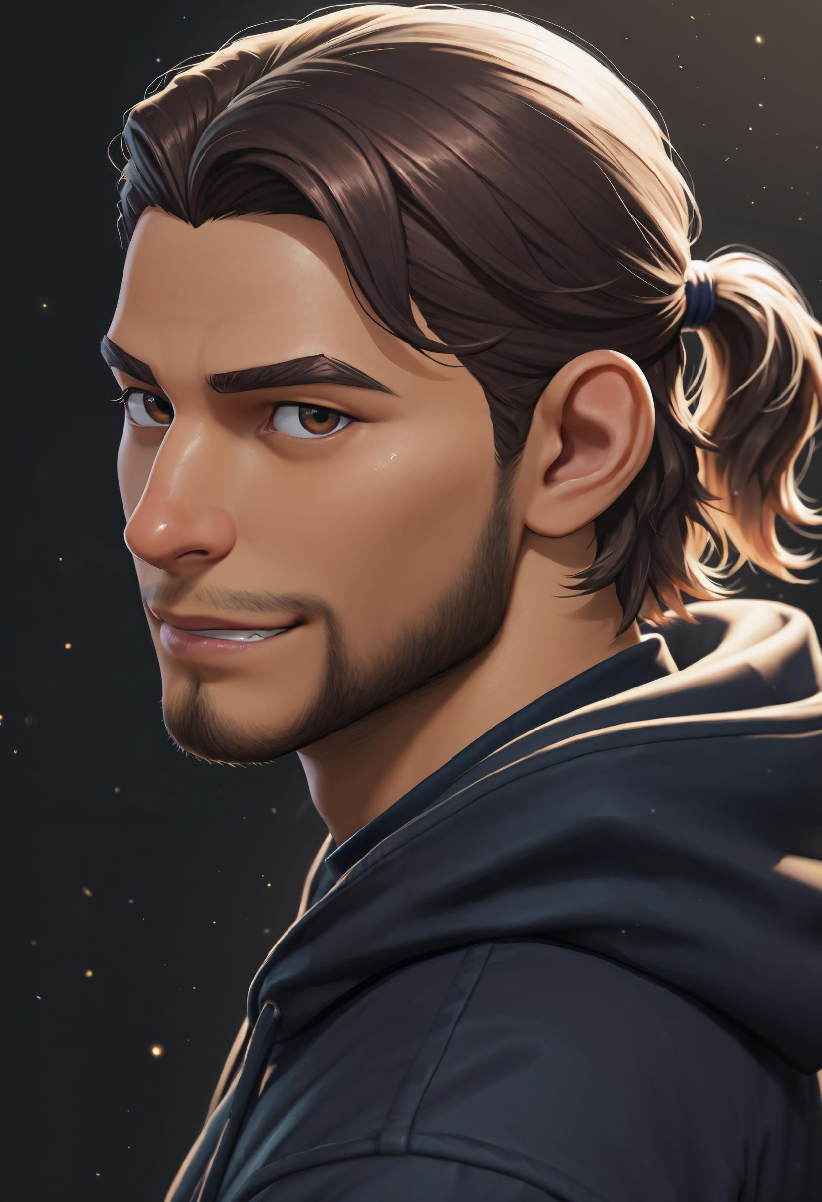 Trigger words: p3rs3us, dark brown hair, brown eyes, light tan skin, medium length brown hair, short ponytail, short beard