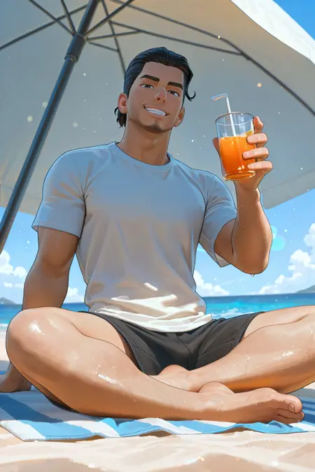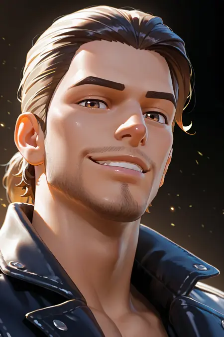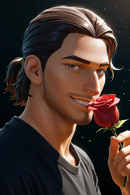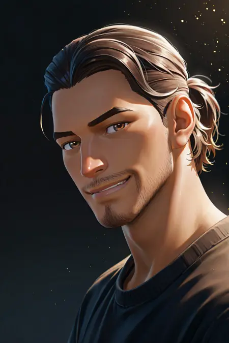 Trigger words: p3rs3us, dark brown hair, brown eyes, light tan skin, medium length brown hair, short ponytail, short beard