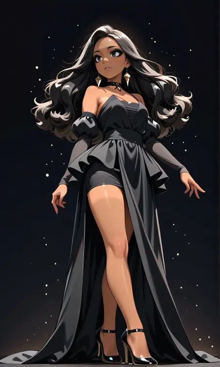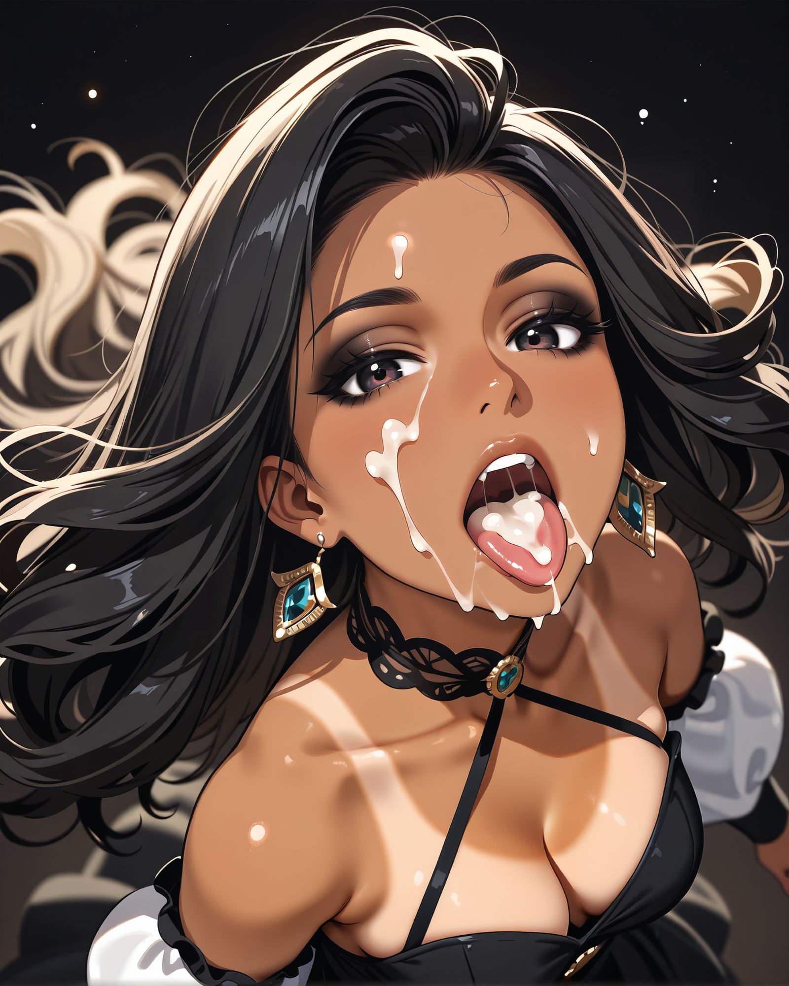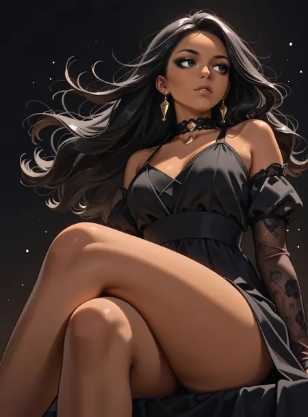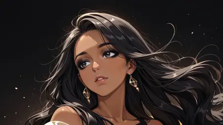 woman, tanned skin tone, dark eyes, black hair, long hair, puffy hair,