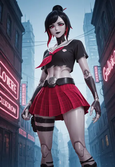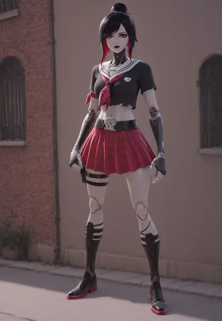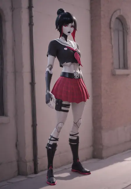 GothTsukiF, 안드로이드, 기계 부품, 회색 피부, 이색 머리카락, 검정 및 빨간 머리카락, 단일 머리 뾰족, 짧은 머리, 빨간 눈, 검은 입술, 찢어진 옷, 로봇 관절, 선원 칼라, 목수건, 검은 셔츠, 세라퓨쿠, 허리선, 벨트, 빨간 체크 스커트, 허벅지 스트랩, 부츠,