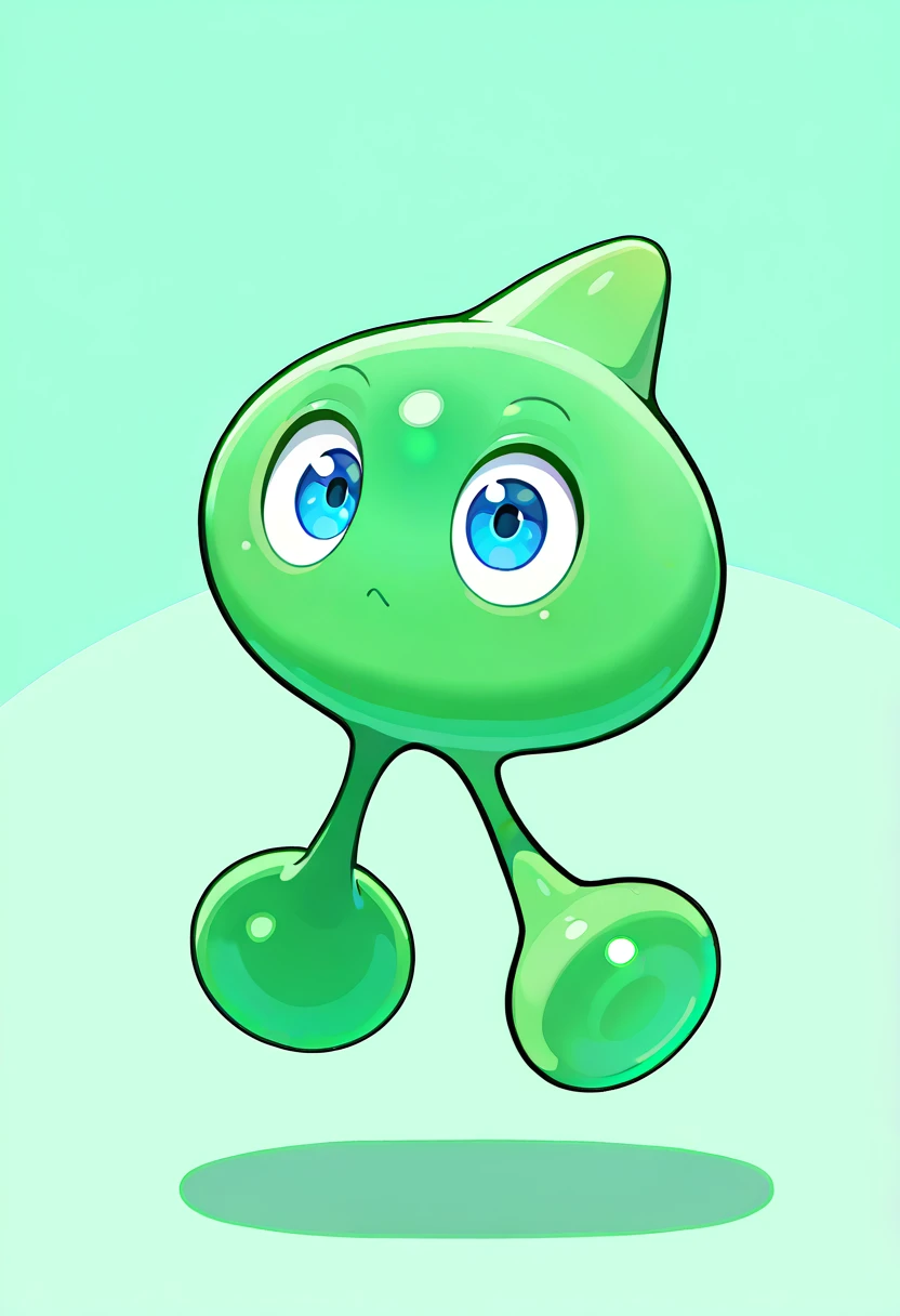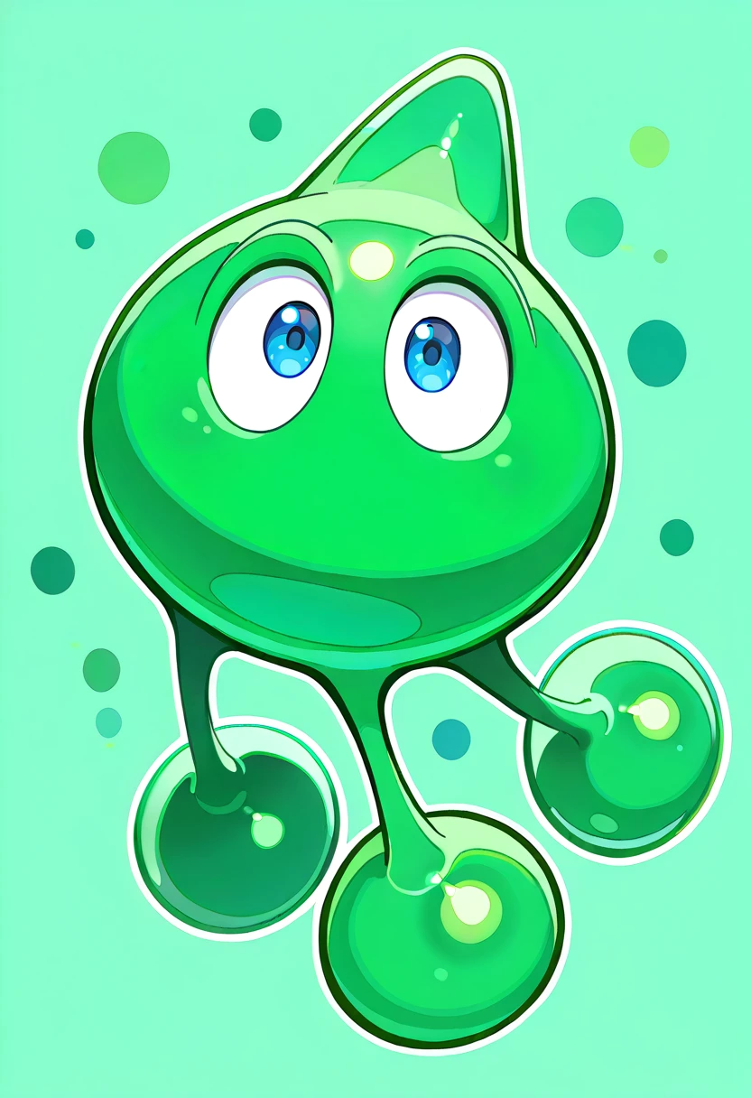 GreenWisp, alien-like creature, smooth bright green rounded body, one prominent blue eye, small spheres connected to base by thin stretchy strands,
