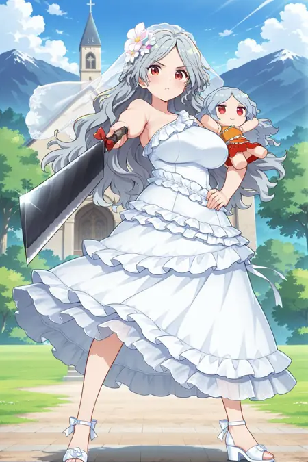sakata nemuno, 1girl, solo, red eyes, grey hair, long hair, wavy hair, sakata nemuno \(white classic of the mountain\), alternate costume, hair flower, hair ornament, bridal veil, white dress, wedding dress, frilled dress, single strap, white sandals, cleaver, nata (tool), character doll,
