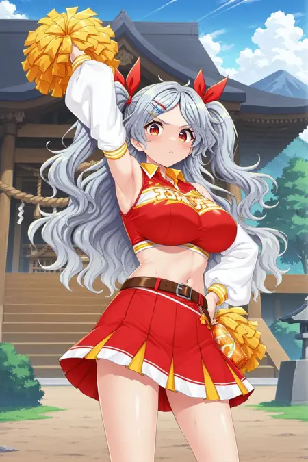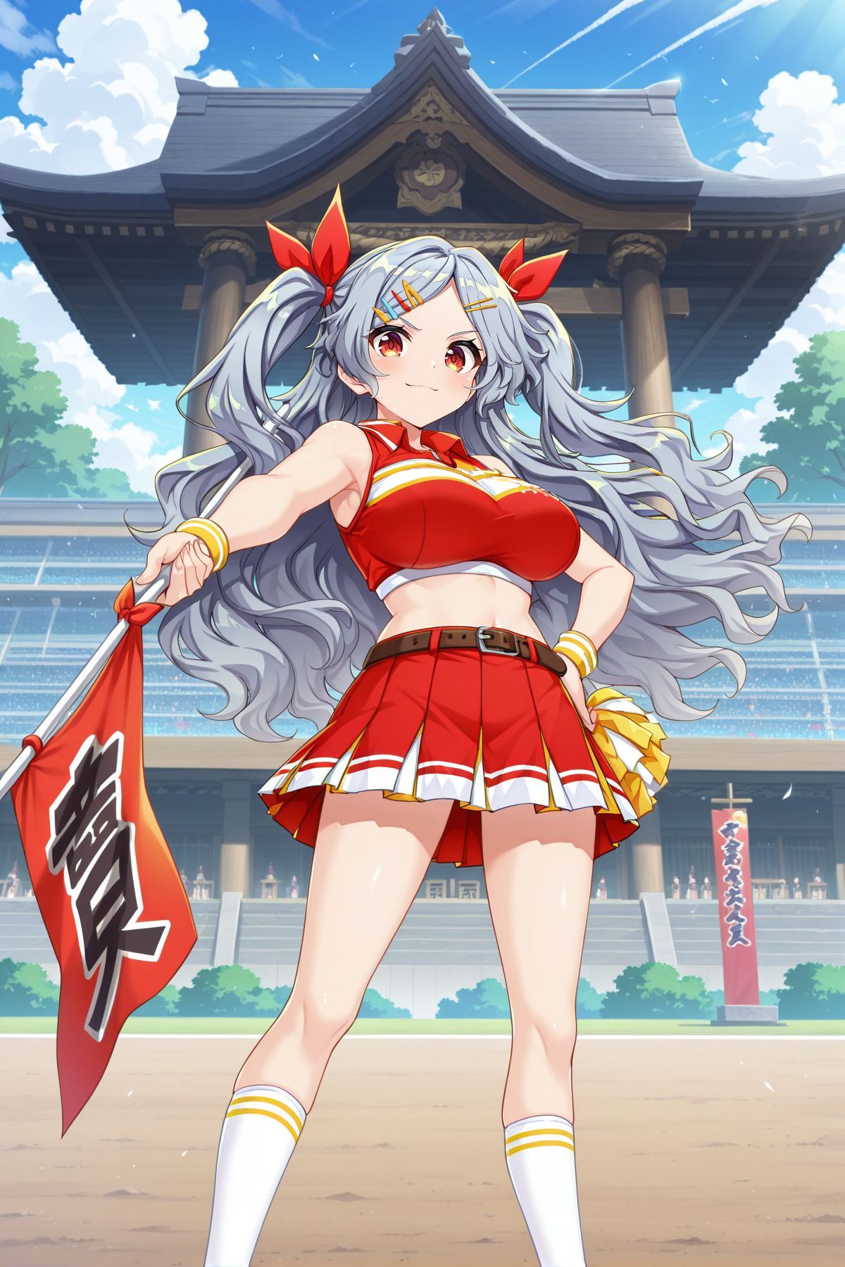 sakata nemuno, 1girl, solo, red eyes, grey hair, long hair, wavy hair, twintails,, sakata nemuno \(fill yourselves up on stadium snacks\), alternate costume, hair ribbon, red ribbon, hairclip, cheerleader, crop top, red shirt, bare shoulders, brown belt, red skirt, pleated skirt, white socks, red shoes, holding flag, red flag,