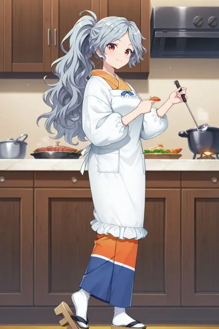 sakata nemuno, 1girl, solo, red eyes, grey hair, long hair, wavy hair, ponytail,, sakata nemuno \(small restaurant chef\), alternate costume, alternate hairstyle, multicolored kimono, orange kimono, blue kimono, pink kimono, japanese clothes, kappougi, white kappougi, white socks, tabi, geta, holding ladle,