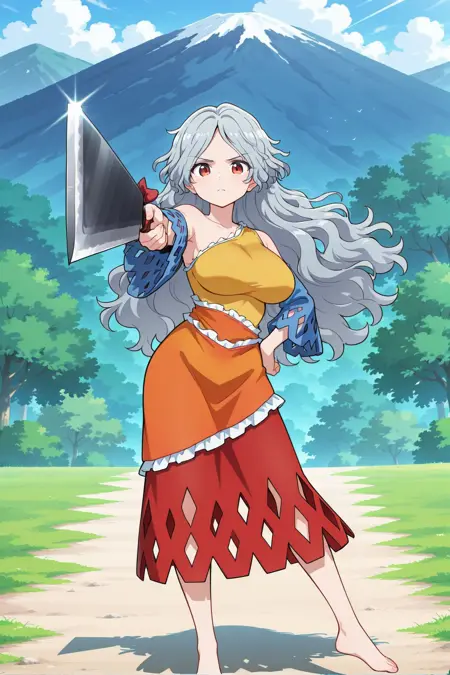 sakata nemuno, 1girl, solo, red eyes, grey hair, long hair, wavy hair, large breasts,