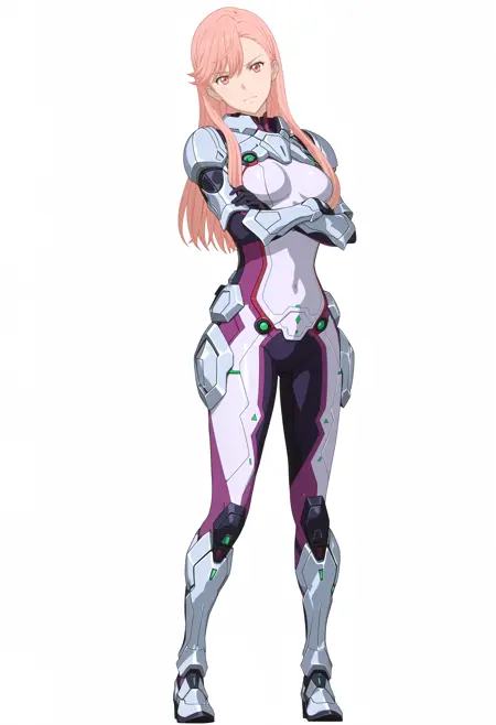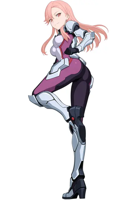 armored bodysuit, purple bodysuit, breastplate, gauntlets, red trim, skin tight, pauldrons, black gloves, sabaton, poleyn, Faulds, Couter