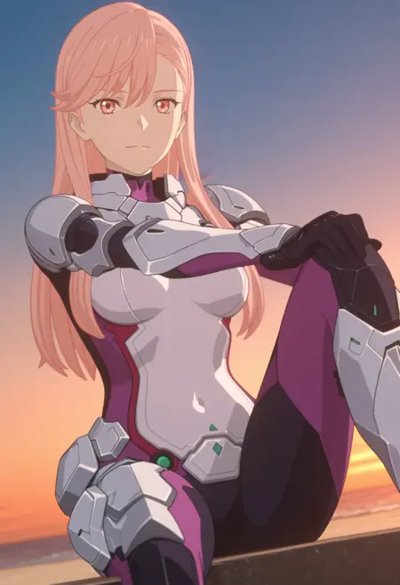 アーマードボディスーツ, 紫のボディスーツ, ブレストプレート, ガンダレット, 赤いトレミング, スキンタイト, パウルドロン, 黒い手袋, サバトン, ポリーン, フォルズ, クーター