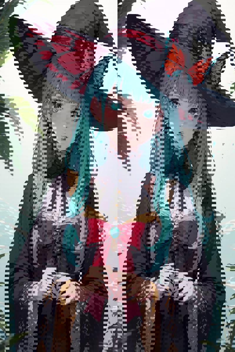 トリガー単語、外見およびアウトフィット: aoliachar, 1girl, solo, witch hat, jewelry, green eyes, earrings, long hair, black dress, gem, white socks, blunt bangs, red bow, long sleeves, shoes, brooch, center frills, black footwear, wide sleeves, black headwear, hat bow, frilled dress, mary janes, aqua hair, bobby socks, ribbon, blue gemstone, straight hair