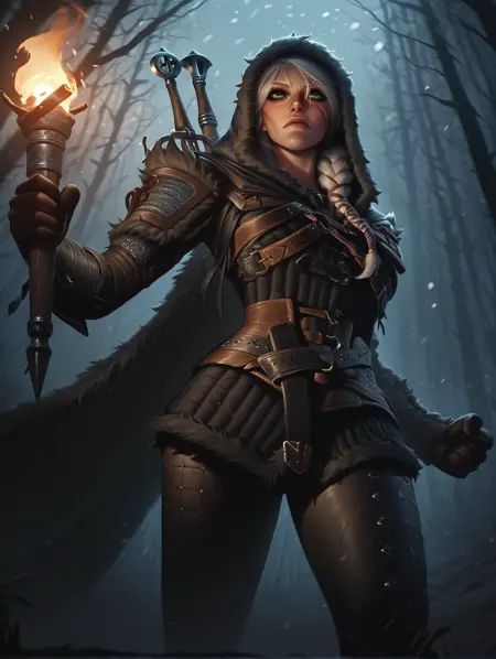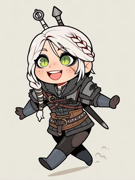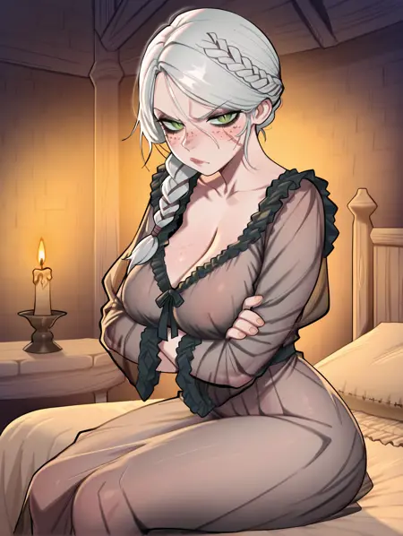 外見プロンプト: ciri_w4_philon、顔の傷、白い髪、緑の目、化粧、ほくろ、編み髪