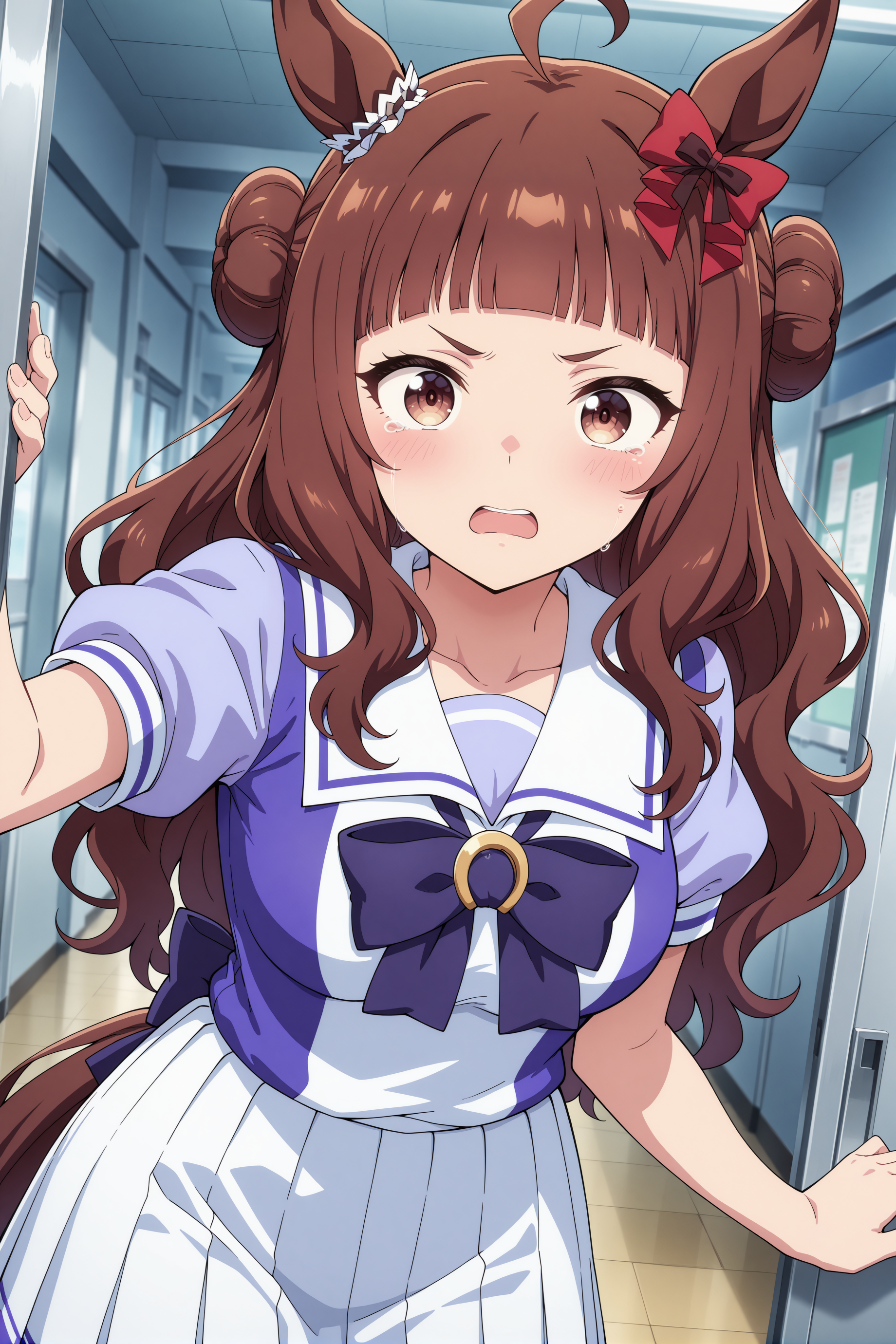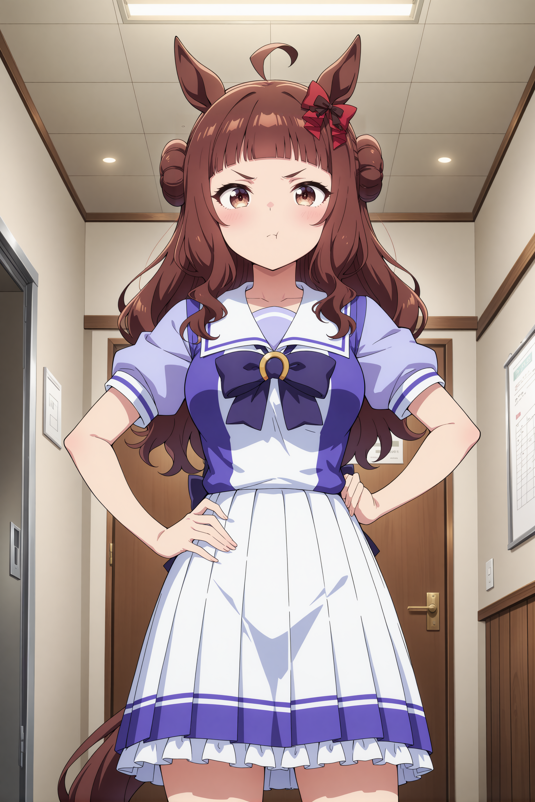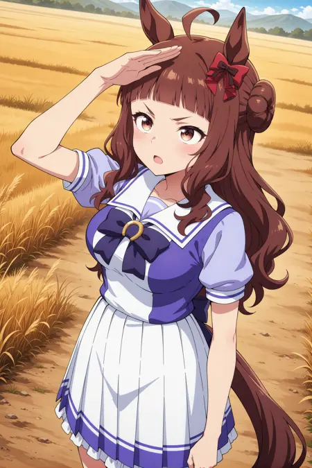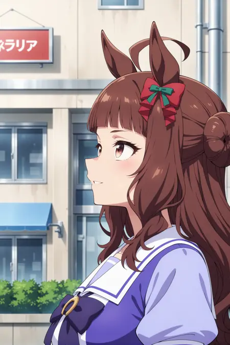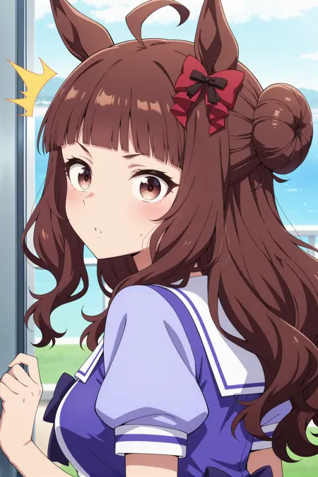for now, as a precaution... umamusume, horse girl, long hair, ahoge, blunt bangs, brown hair, hair bun, red bow, brown eyes, wavy hair, ear ornament, and any prompt for breast size you prefer.