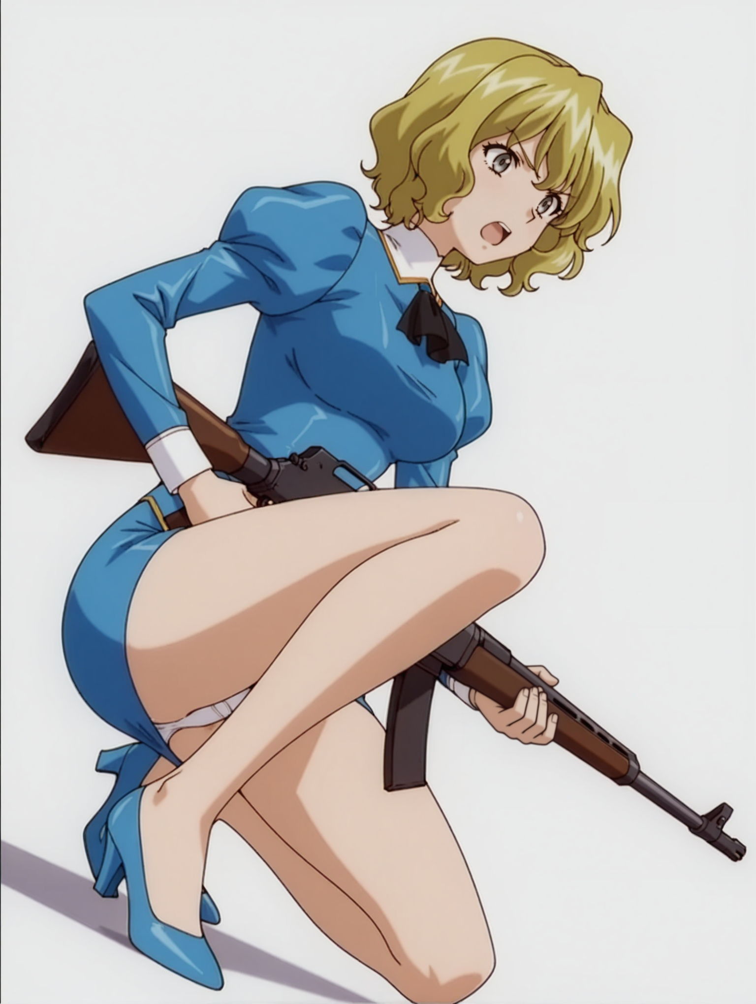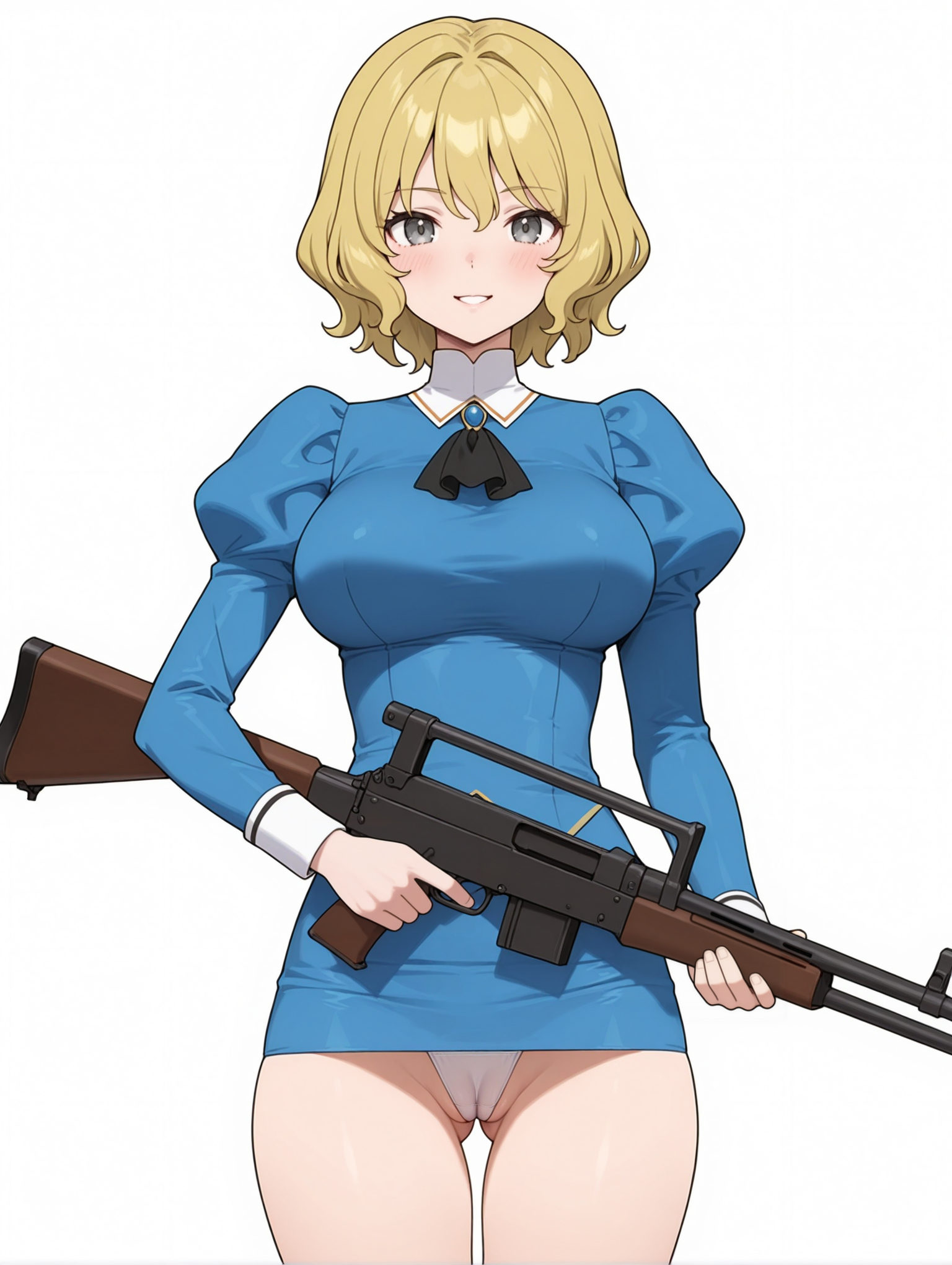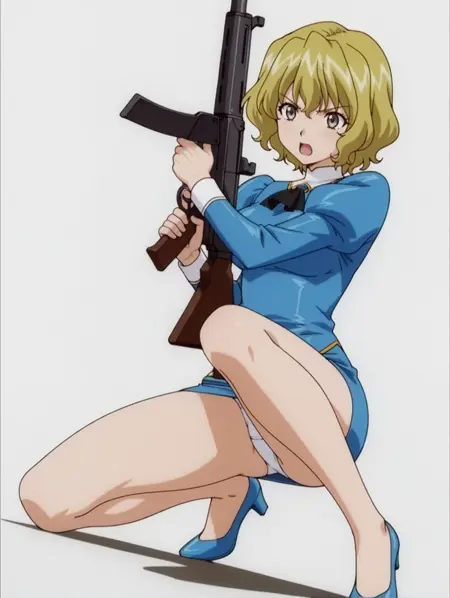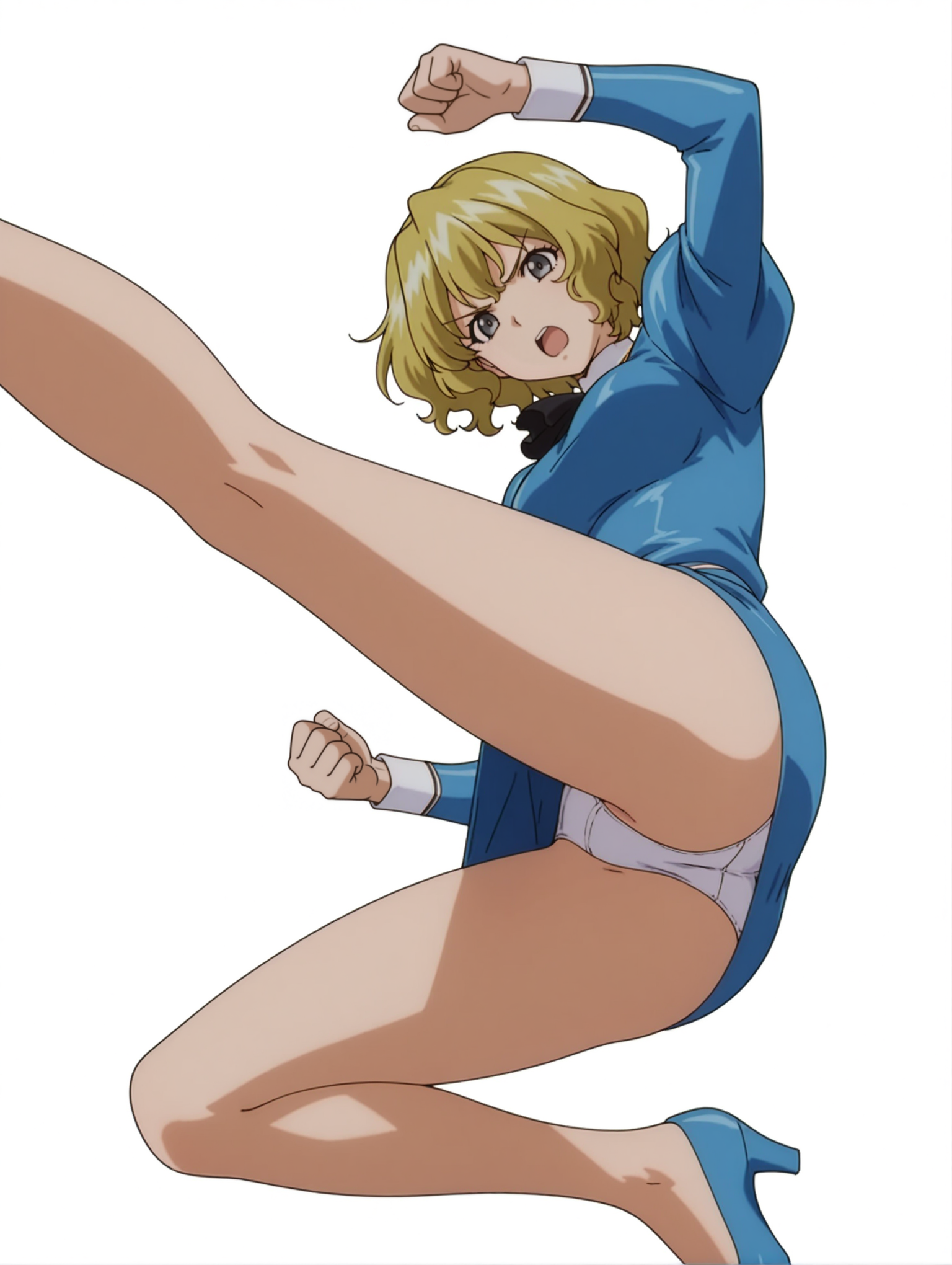 衣装ワード ・b_clothes,black ascot,blue dress,juliet sleeves,long sleeves,blue pencil_skirt,white panties,no socks,blue high heels,