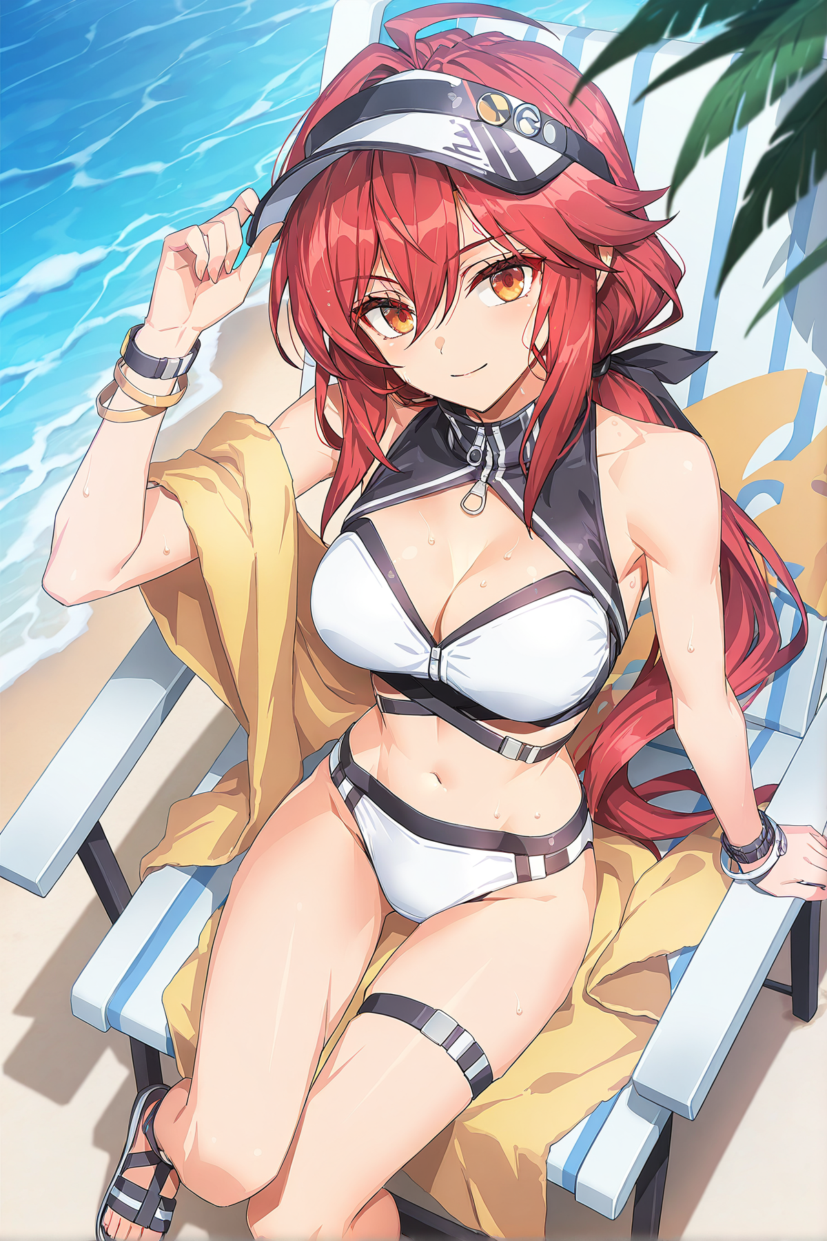 gc_elesist, school uniform, red hair, ahoge, long hair, amber eyes, high ponytail, hair clip, medium breasts, red necktie, medium sleeves shirt, untucked white shirt, brown sleeveless sweater, rubber bracelet, brown mini skirt, white socks, red sneakers, black backpack