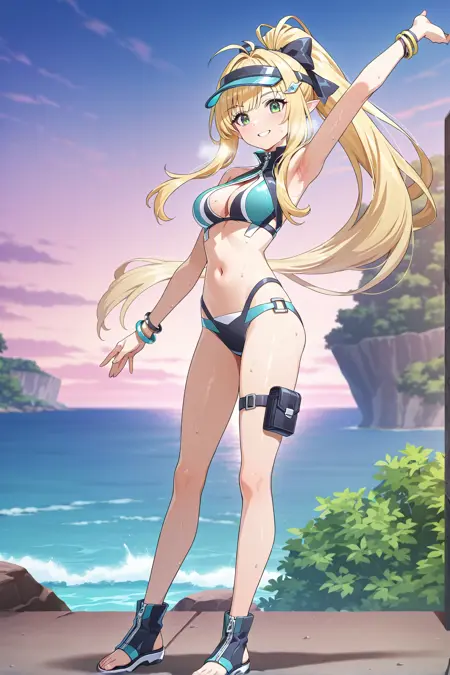 green eyes, ahoge, blonde hair, pointy ears, ponytail, long hair, hair bow, visor cap, medium breasts, multicolored halter bikini, zipper on neck, bracelet, toeless footwear