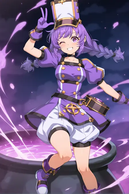 purple eyes, medium hair, purple hair, twin braids, hat, medium breasts, purple dress, puffy sleeves, purple gloves, white puffy shorts, purple boots