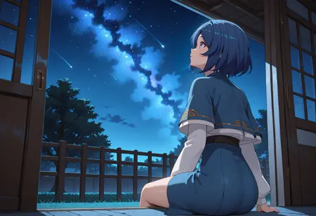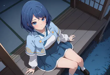 white shirt, blue capelet, long sleeves, blue skirt,